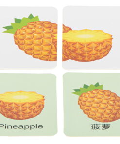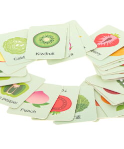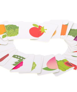 – 56 carduri ce au pe spate, doua cate doua, o imagine cu o fructa sau leguma pentru asociere, iar pe fata denumirea fructului/legumei in engleza