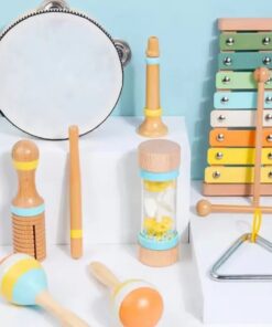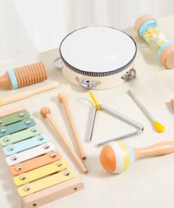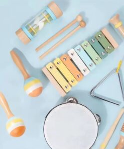 Setul de 7 instrumente muzicale din lemn este conceput special pentru a introduce copiii în lumea sunetelor și a ritmului, stimulând dezvoltarea senzorială și coordonarea mână-ochi. Fiecare instrument este realizat din materiale sigure, atent finisate pentru a se potrivi mânuțelor mici ale copiilor.