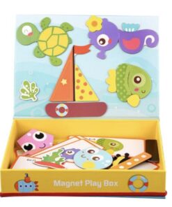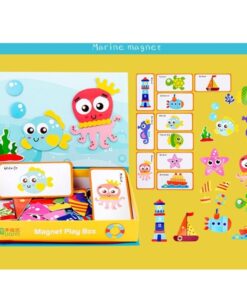 Include piese magnetice viu colorate, cu tematică marină: caracatiță, pești, meduze, stele de mare, bărci, submarine și multe altele.