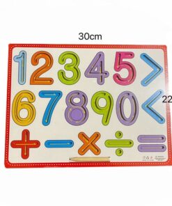 Joc educativ, de tip Montessori, usor de folosit acasa sau la gradinita. O placa din lemn, pe care sunt sculptate cifrele de la 0 la 9 si semnele aritmetice. Fiecare cifra este colorata diferit, pentru a se diferentia si a se intipari in mintea celor mici, pe masura ce misca pixul din lemn pe sagetile indicative de la fiecare caracter in parte.