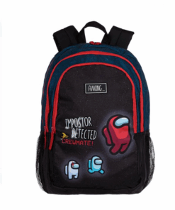 Ghiozdan cu model Among Us, cu un compartiment mare, o husa pentru laptop, 2 buzunare cu fermoar si un buzunar cu plasa lateral.