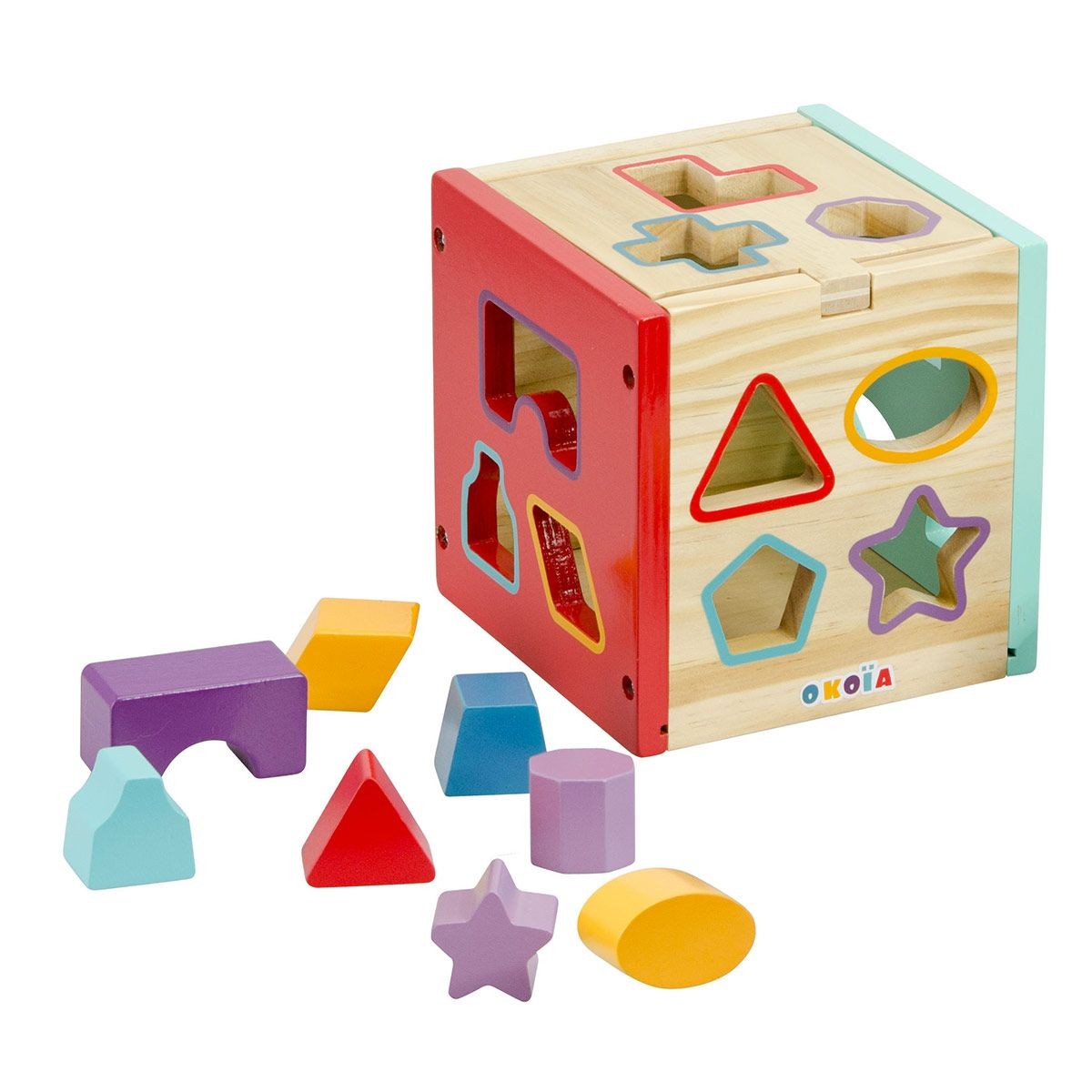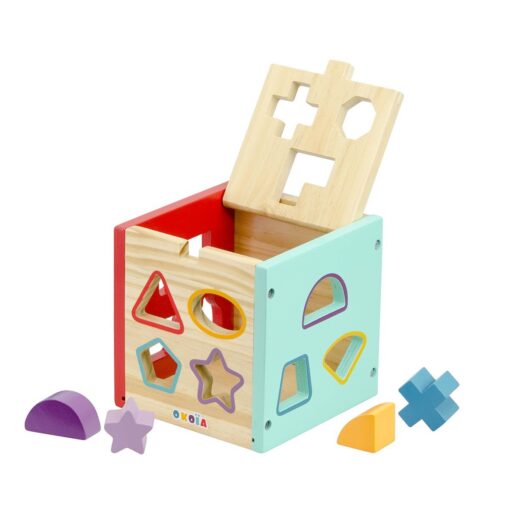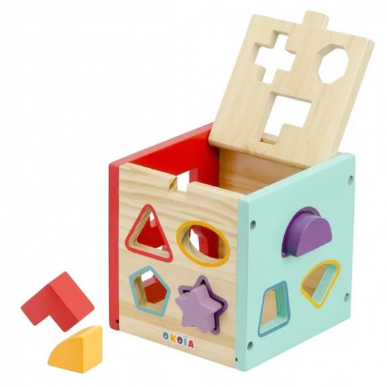 Cubul sortator este o jucărie educativă din lemn, gândită pentru a sprijini dezvoltarea timpurie a copiilor începând cu vârsta de 12 luni. Fiecare dintre cele 5 fețe laterale și capacul superior include decupaje în forme variate, în care copilul trebuie să potrivească cele 13 forme geometrice colorate incluse în set. Formele sunt viu colorate, sigure și adaptate pentru mânuțele mici ale copiilor.