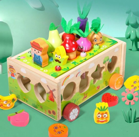 ✔ Sortator de forme – cei mici pot introduce diferite fructe și legume în orificiile potrivite, dezvoltând coordonarea mână-ochi și recunoașterea formelor.