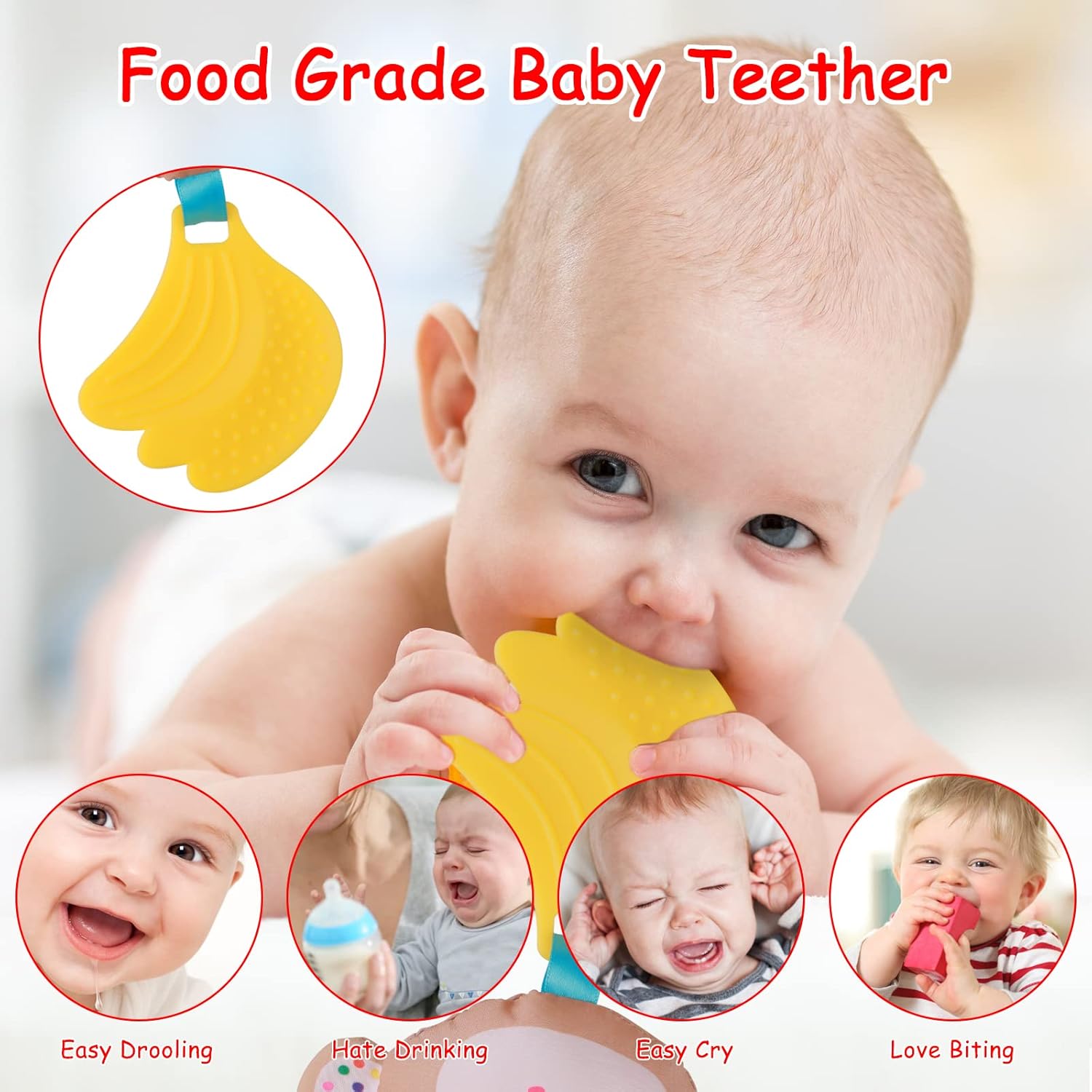 - Jucărie pentru dentiție în formă de banană – fabricată din silicon alimentar, ajută la calmarea gingiilor în timpul apariției dinților.