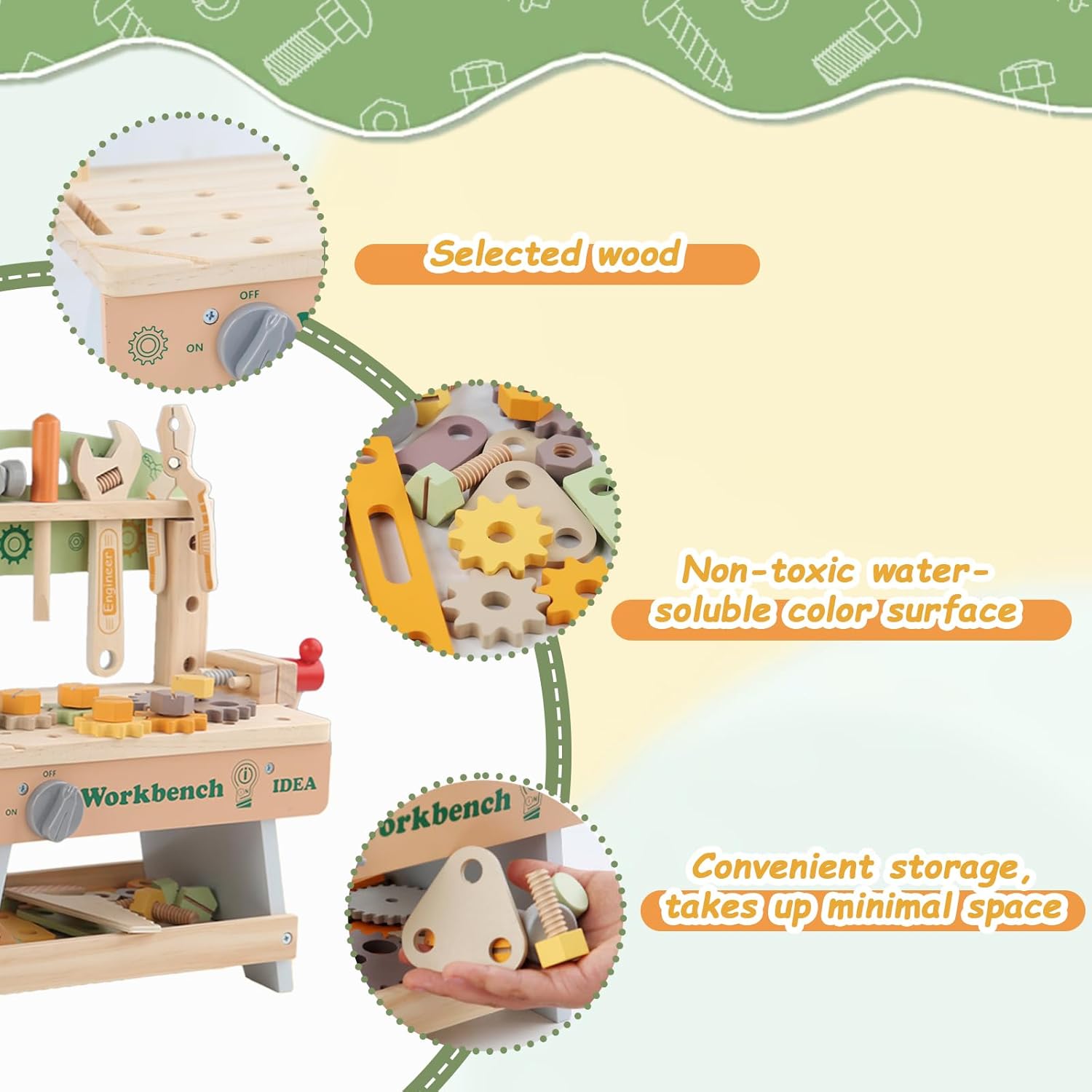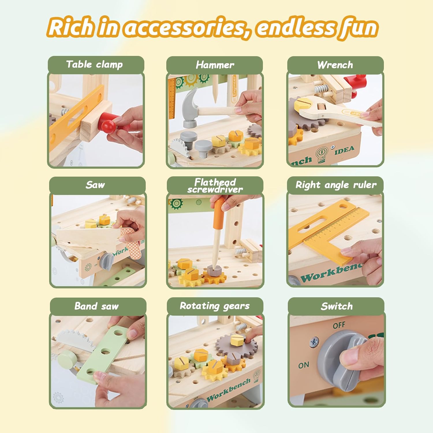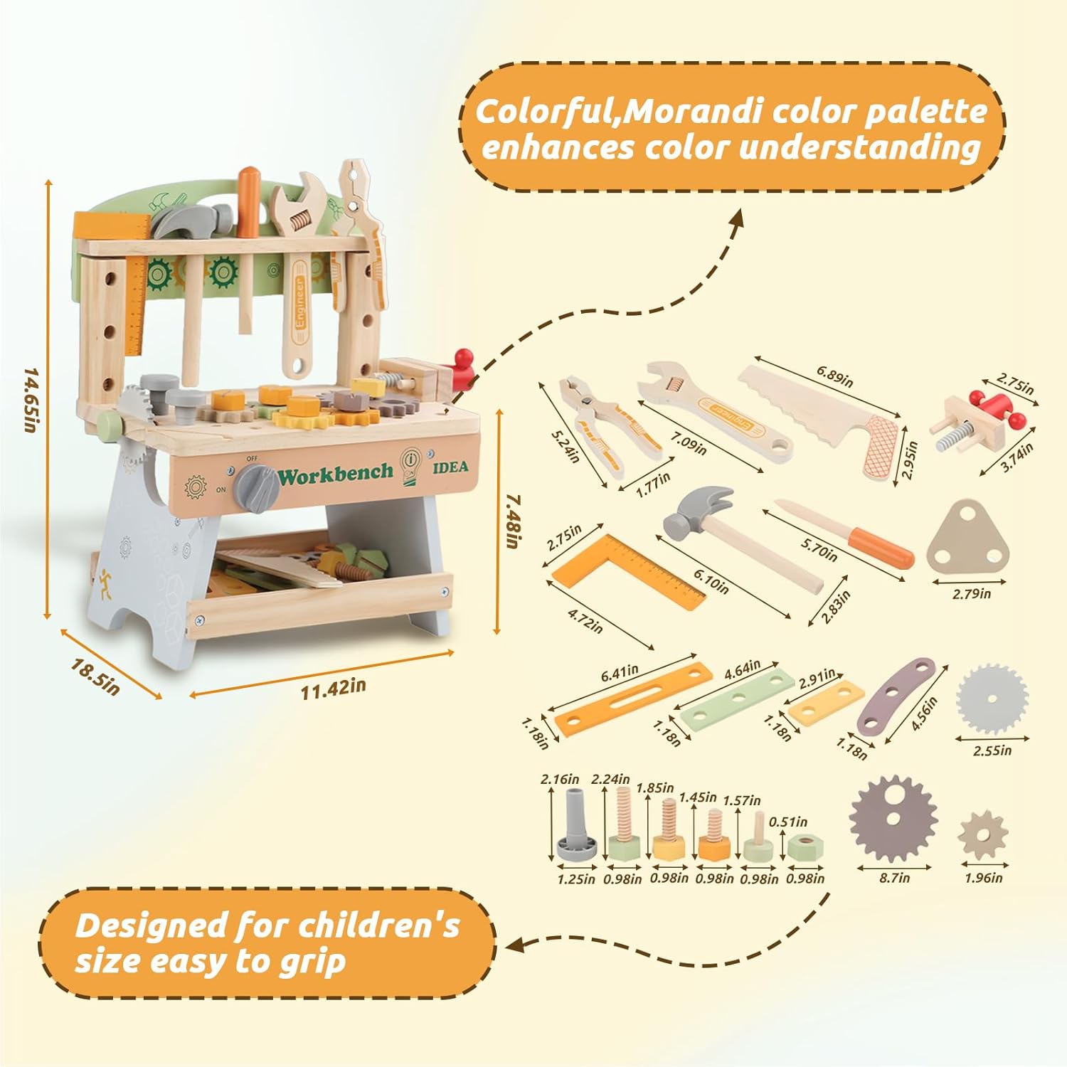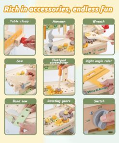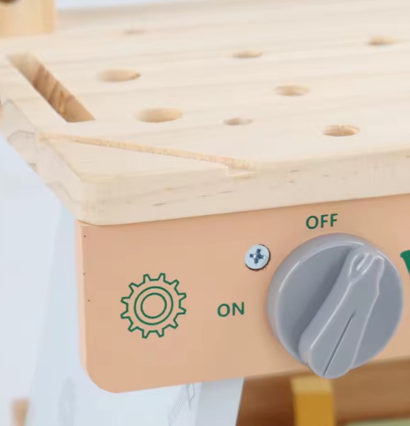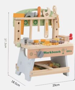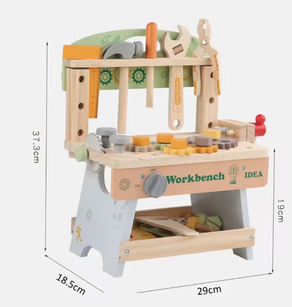 Bancul include multiple accesorii (ciocan, chei, șurubelniță, ruletă, ferăstrău, piulițe, șuruburi și plăci de îmbinare), oferind copiilor posibilitatea să învețe cum să asambleze, să înșurubeze și să creeze diverse structuri, dezvoltând astfel abilități practice esențiale.
