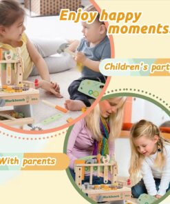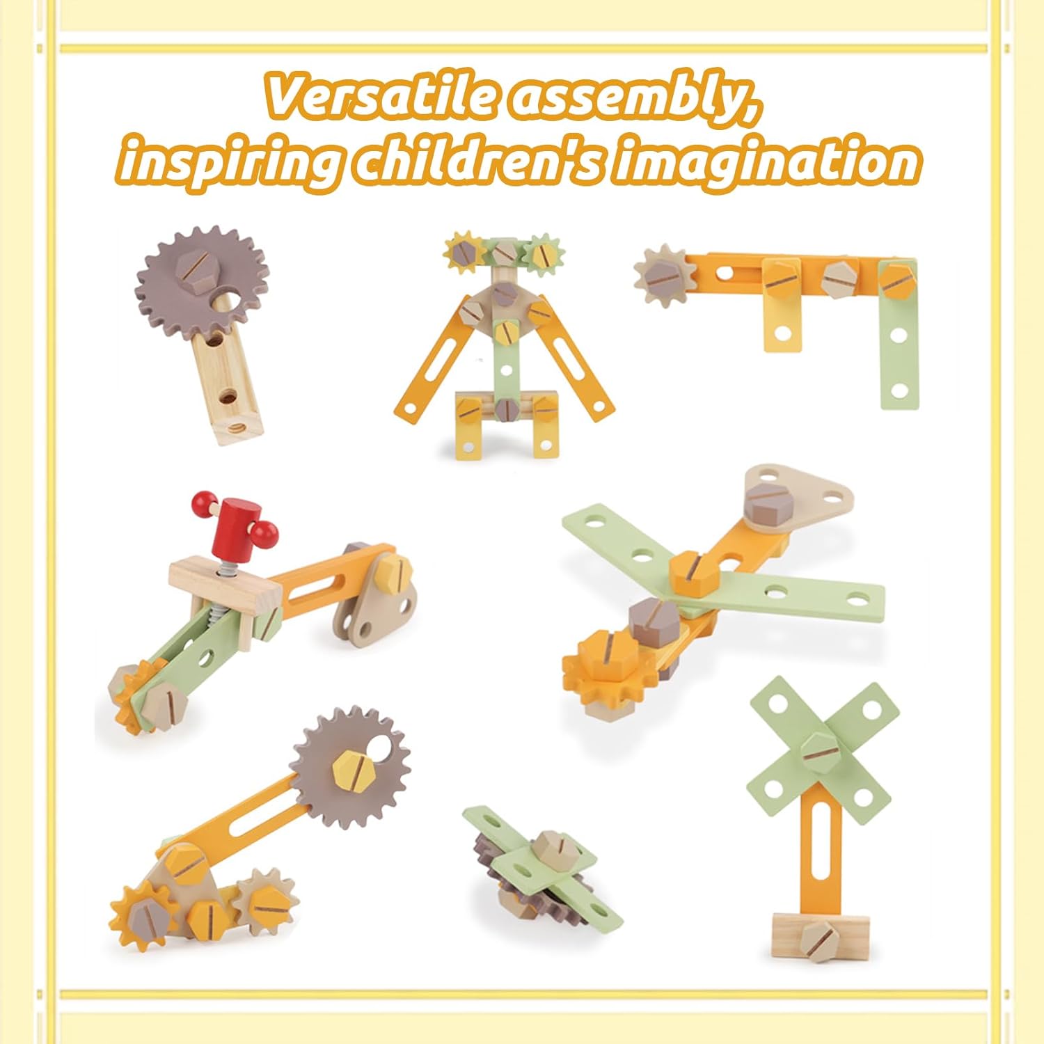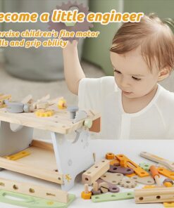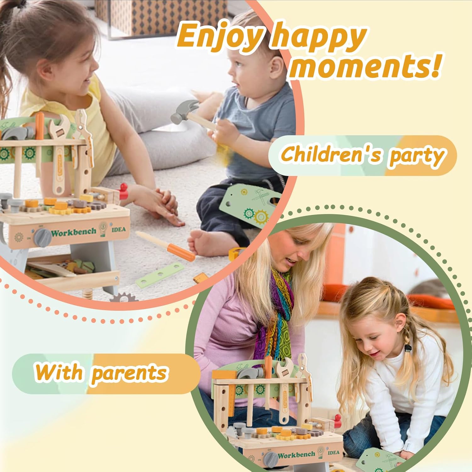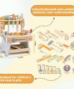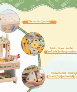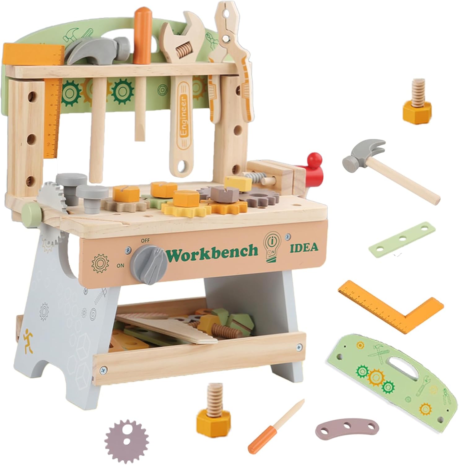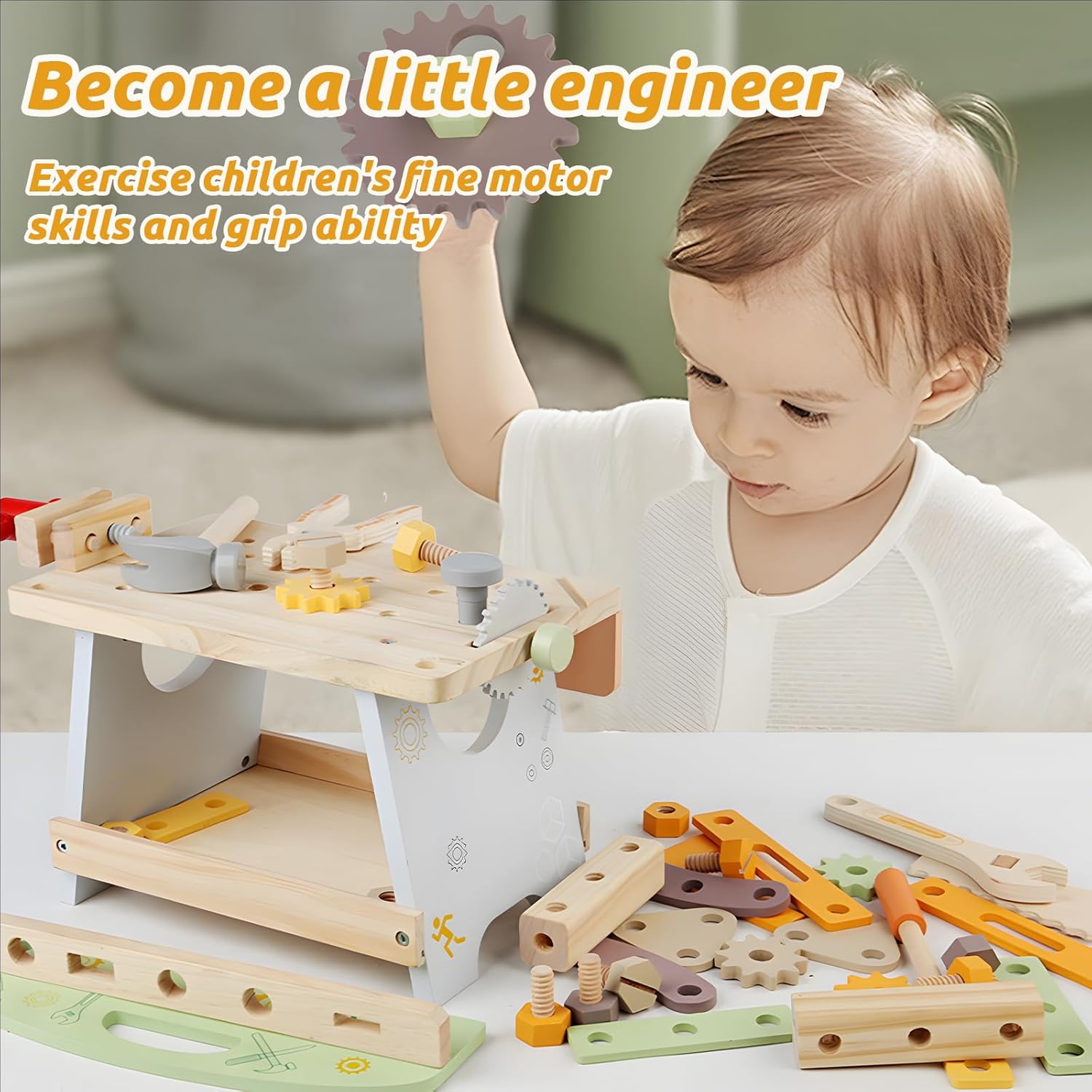 Bancul include multiple accesorii (ciocan, chei, șurubelniță, ruletă, ferăstrău, piulițe, șuruburi și plăci de îmbinare), oferind copiilor posibilitatea să învețe cum să asambleze, să înșurubeze și să creeze diverse structuri, dezvoltând astfel abilități practice esențiale.