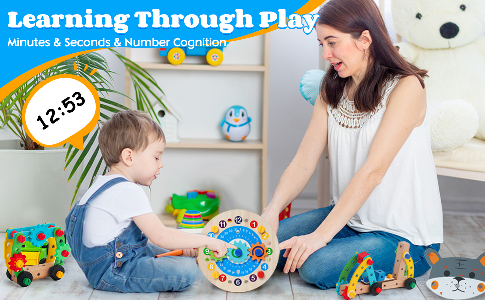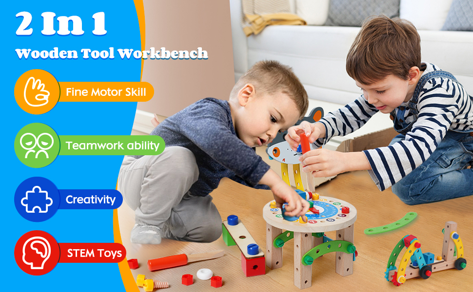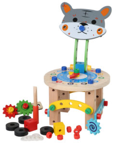 Copilul poate folosi bancul ca scaunel cu banc de scule, învățând să înșurubeze și să combine piesele, să construiască vehicule sau structuri și să experimenteze rolul de mic meșter. Cadranul cu cifre îl ajută să descopere noțiunile de timp, iar accesoriile colorate susțin învățarea culorilor și formelor.
