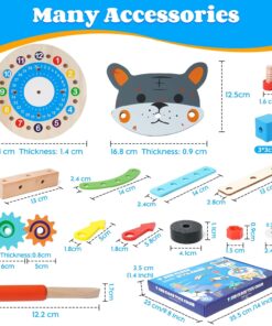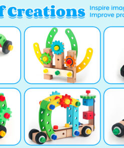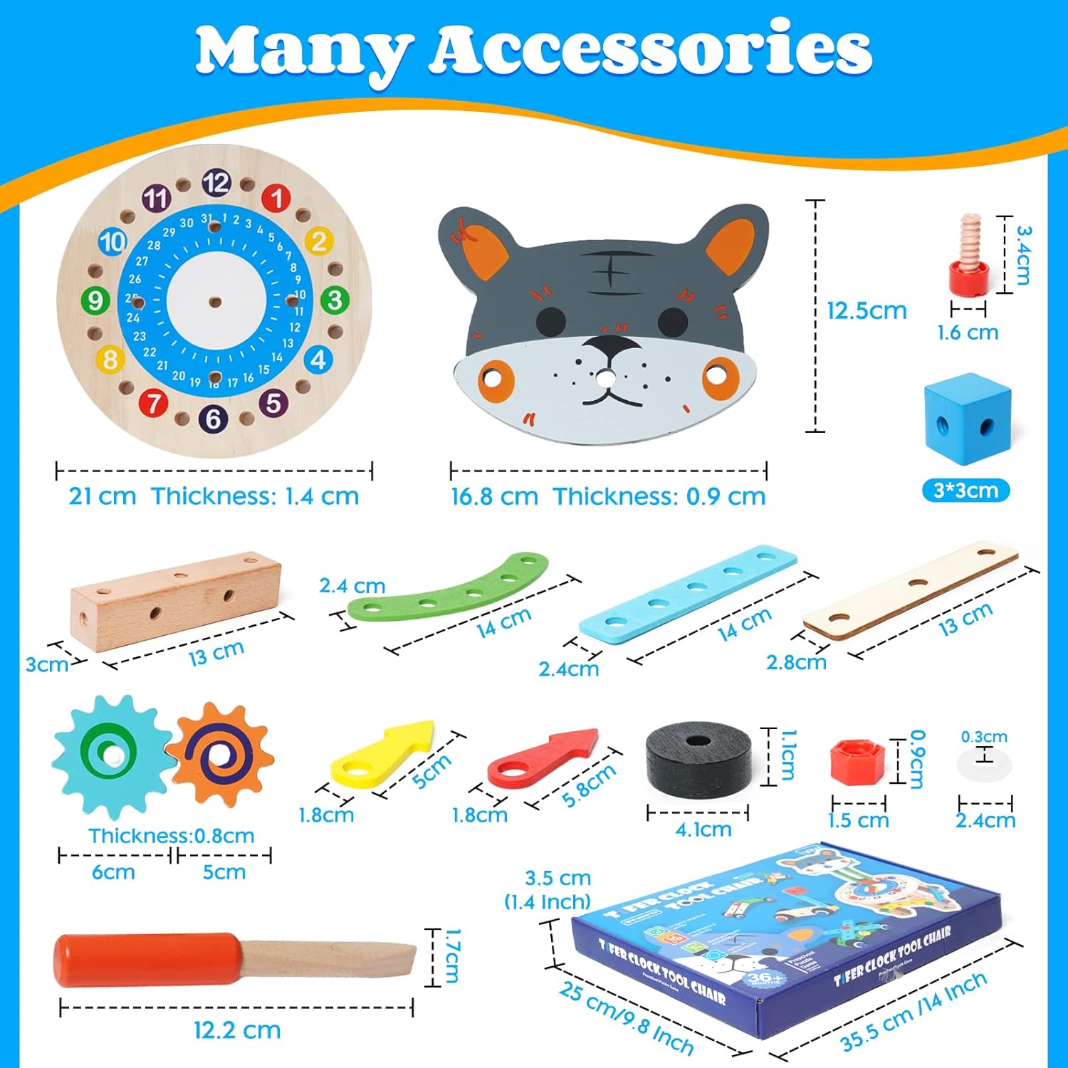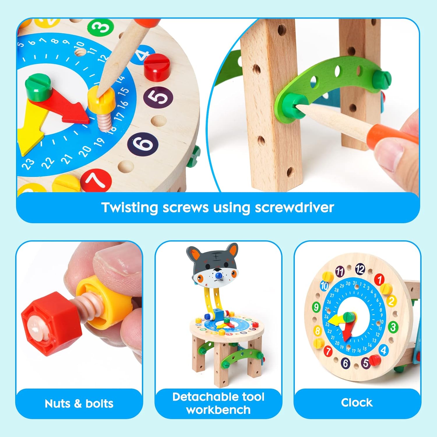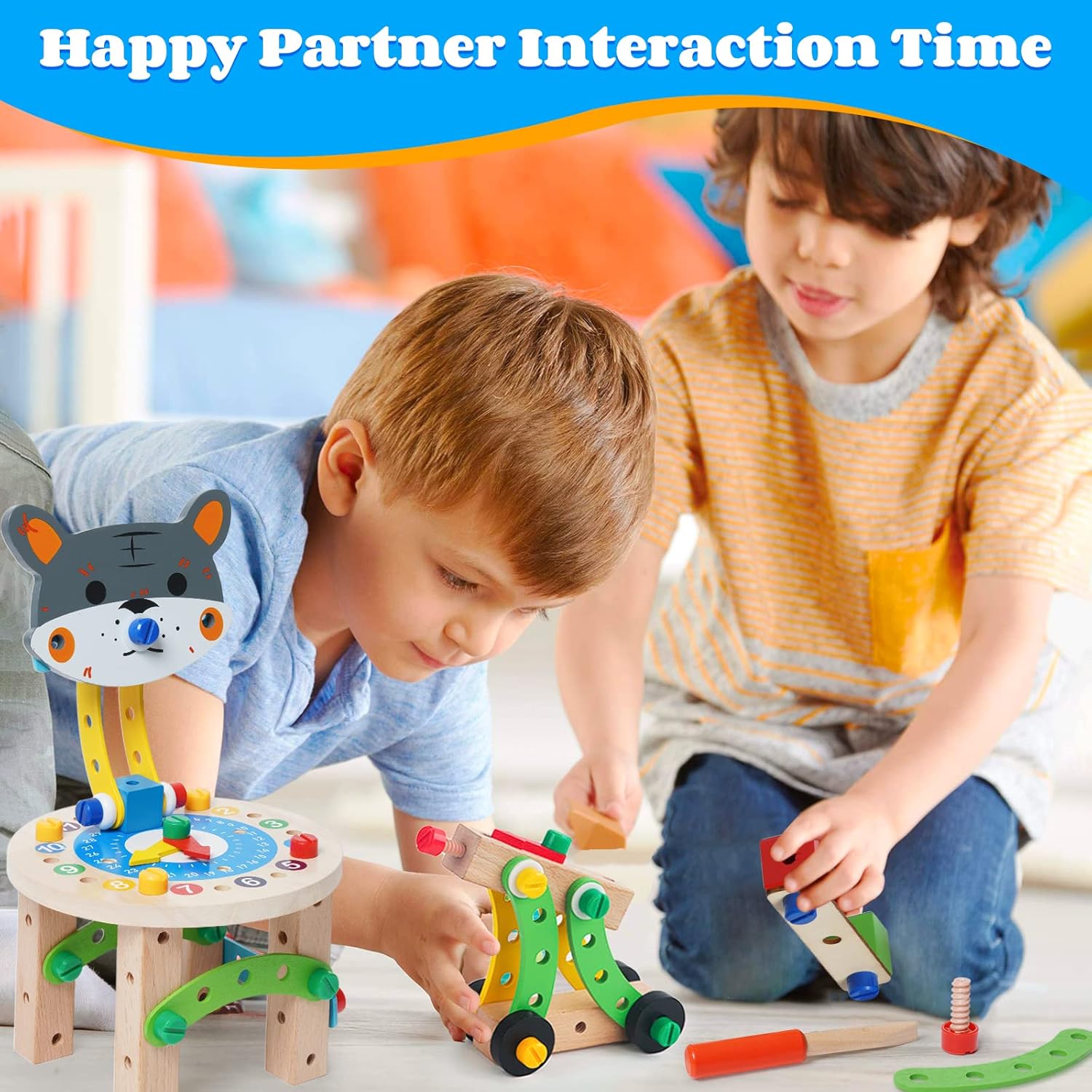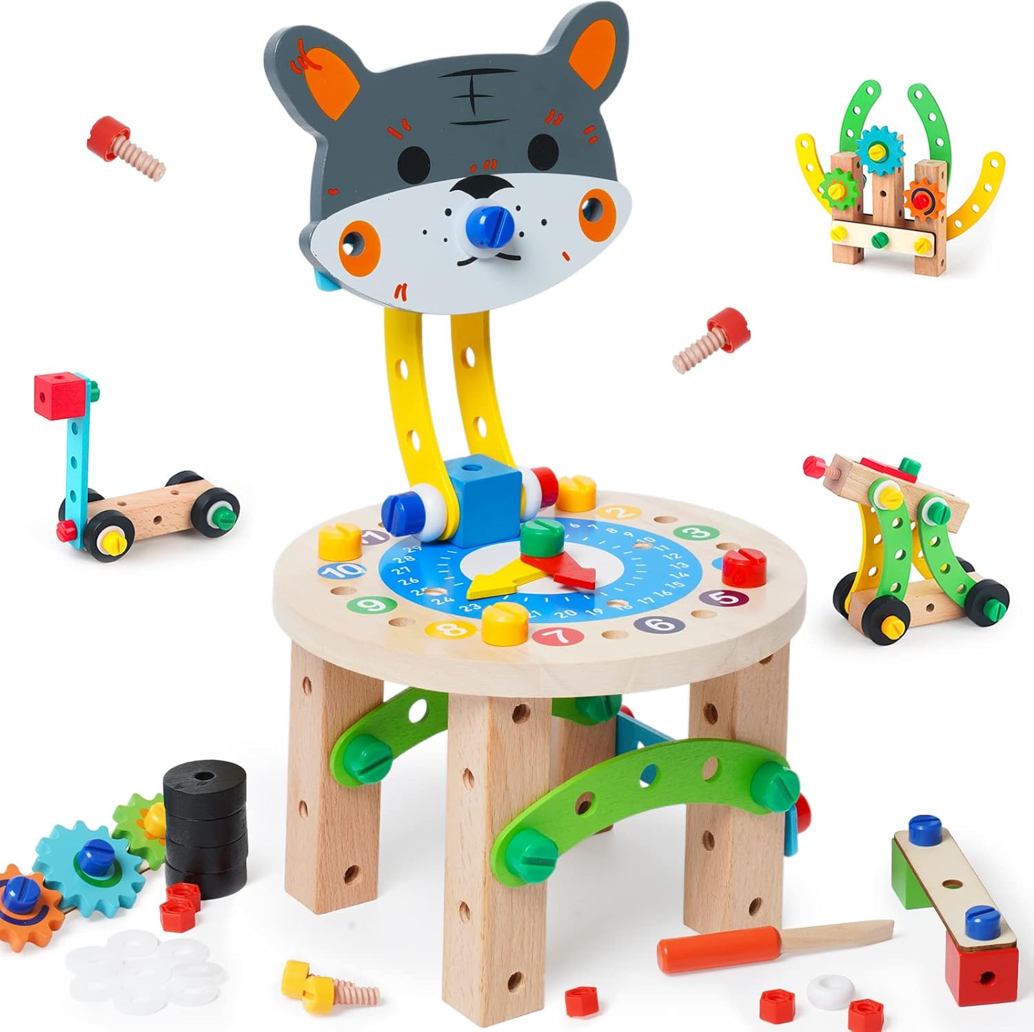 Acest banc de lucru educativ din lemn, sub formă de scăunel cu design simpatic de cățeluș, este o jucărie multifuncțională pentru copiii de la 3 ani în sus, ideală pentru joaca de rol și dezvoltarea abilităților practice. Setul include piese din lemn colorate, șuruburi, piulițe, rotițe și accesorii care pot fi asamblate și dezasamblate, stimulând imaginația și gândirea logică.
