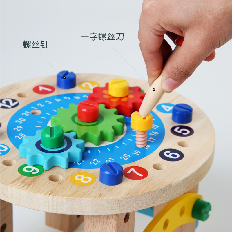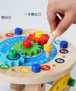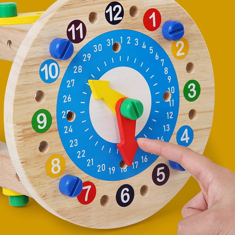 Piese incluse: scaun de lucru, ceas educativ, șuruburi, piulițe, rotițe, șurubelniță, plăcuțe de construcție.