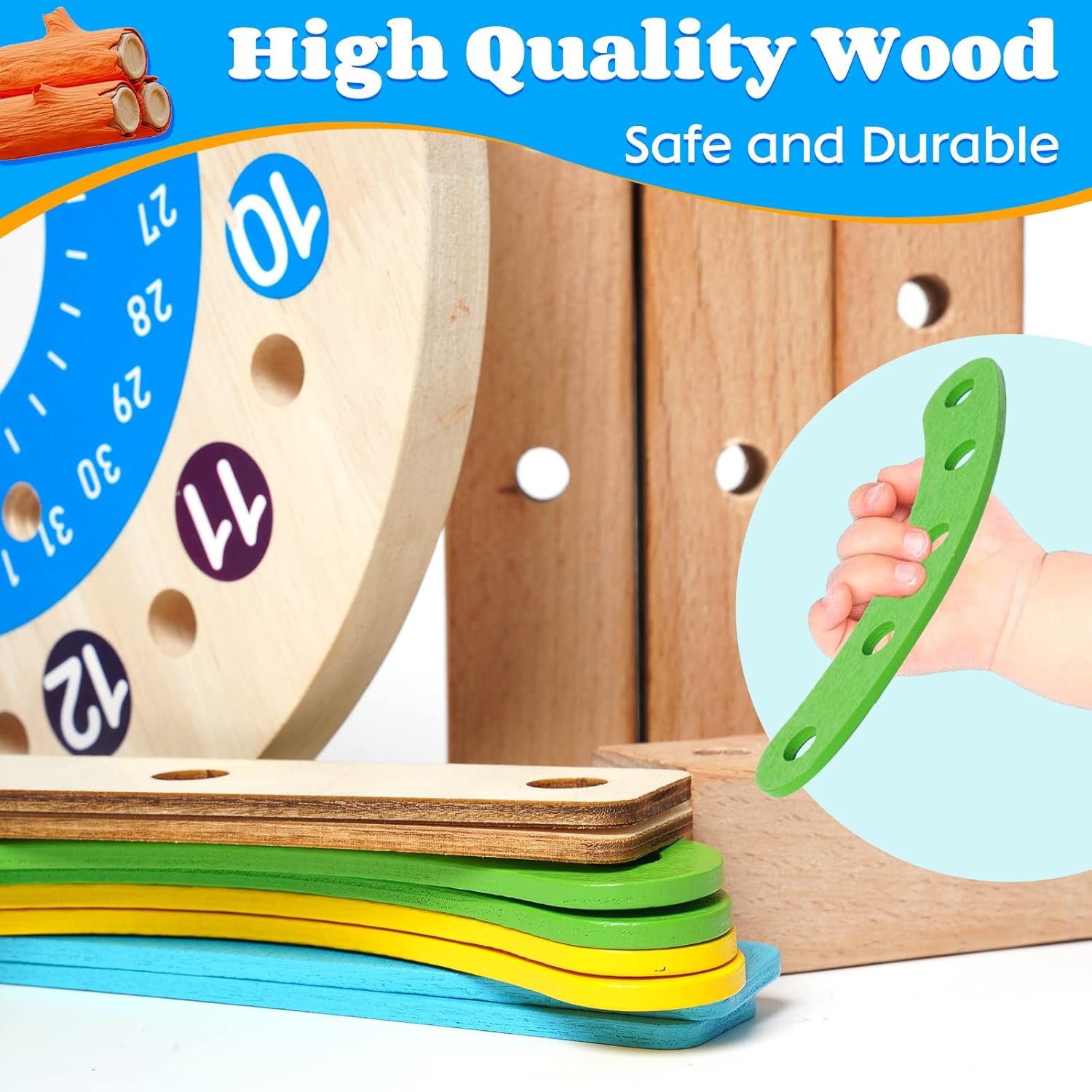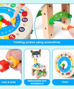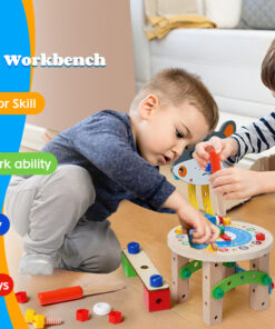 Fabricat din lemn de calitate, netratat chimic, cu margini rotunjite și vopsele non-toxice, bancul de lucru este sigur pentru copii și rezistent în timp. Scaunul poate fi folosit ca banc de scule, ceas educativ sau mini-machetă de construcții, oferind multiple posibilități de joacă creativă.