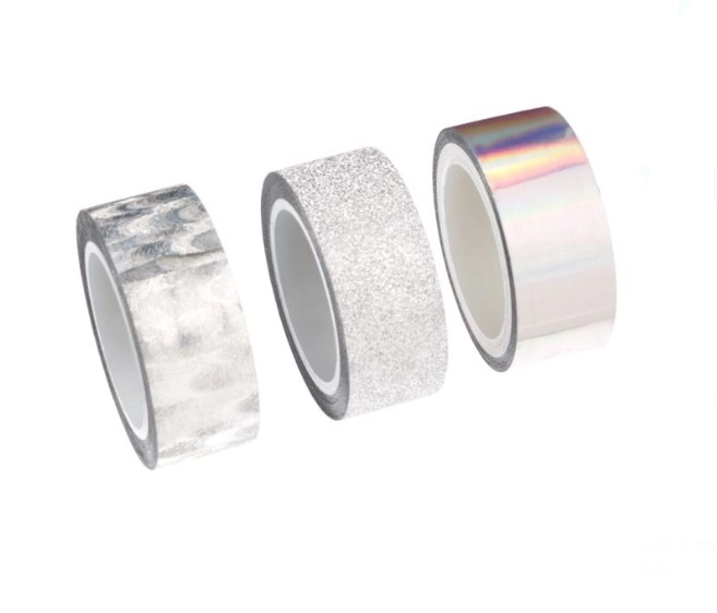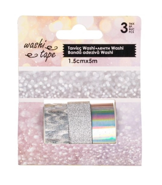 Setul contine 3 bucati de banda adeziva in culori metalizate, argintii ideale pentru activitati lucru manual, activitati crafts sau ambalarea cadourilor.