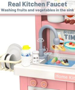 Chiuveta funcționează cu apă reală, permițând copiilor să spele fructele, legumele sau vasele incluse.