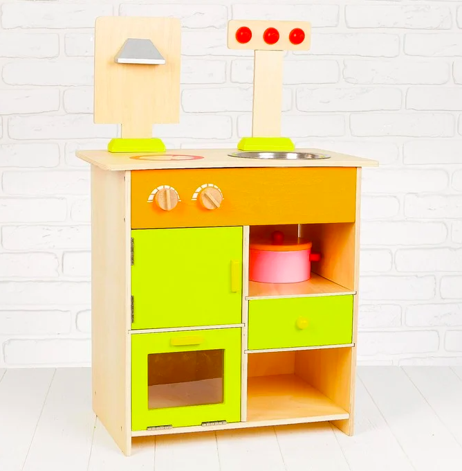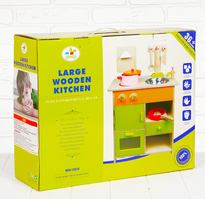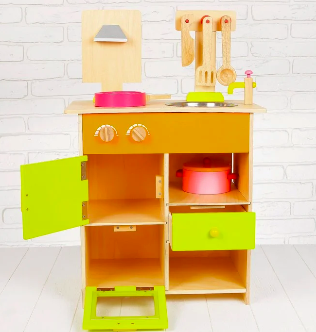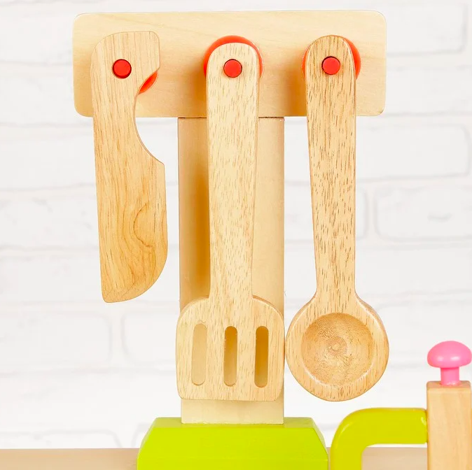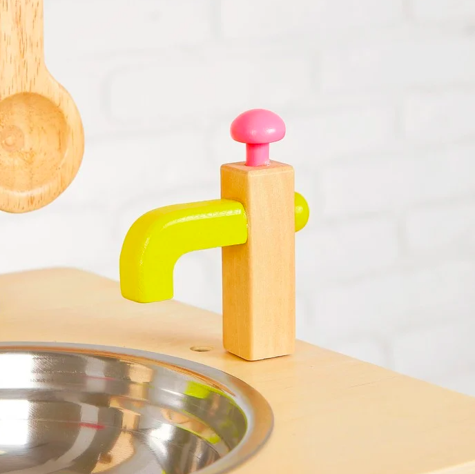 Fabricată din lemn de calitate, bucătăria este rezistentă și vopsită cu culori non-toxice, fiind sigură pentru copii. Această bucătărie frumos finisată este perfectă pentru a stimula interesul celor mici în activitățile de zi cu zi și pentru a-i încuraja să descopere lumea gătitului într-un mod distractiv și sigur.