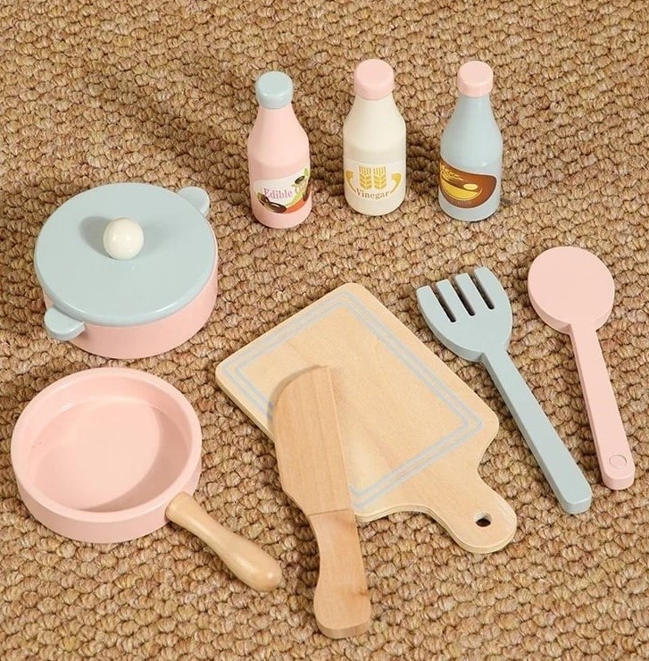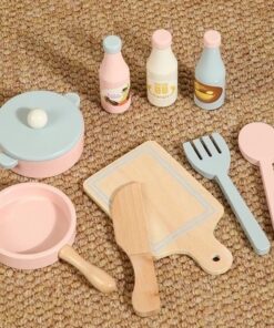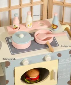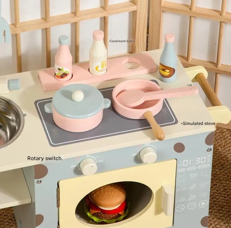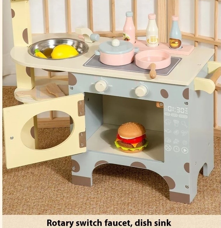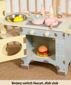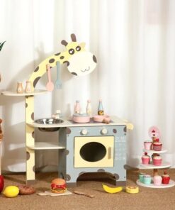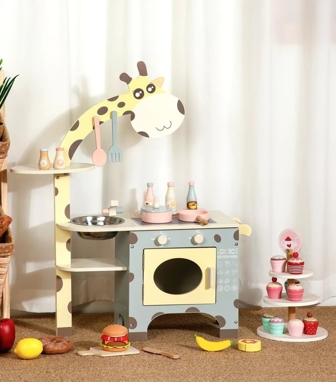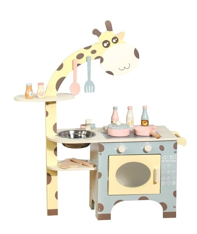 Această bucătărie din lemn cu girafă este mai mult decât o jucărie – este o scenă perfectă pentru ca micuțul tău să își imagineze că este un mare chef bucătar!