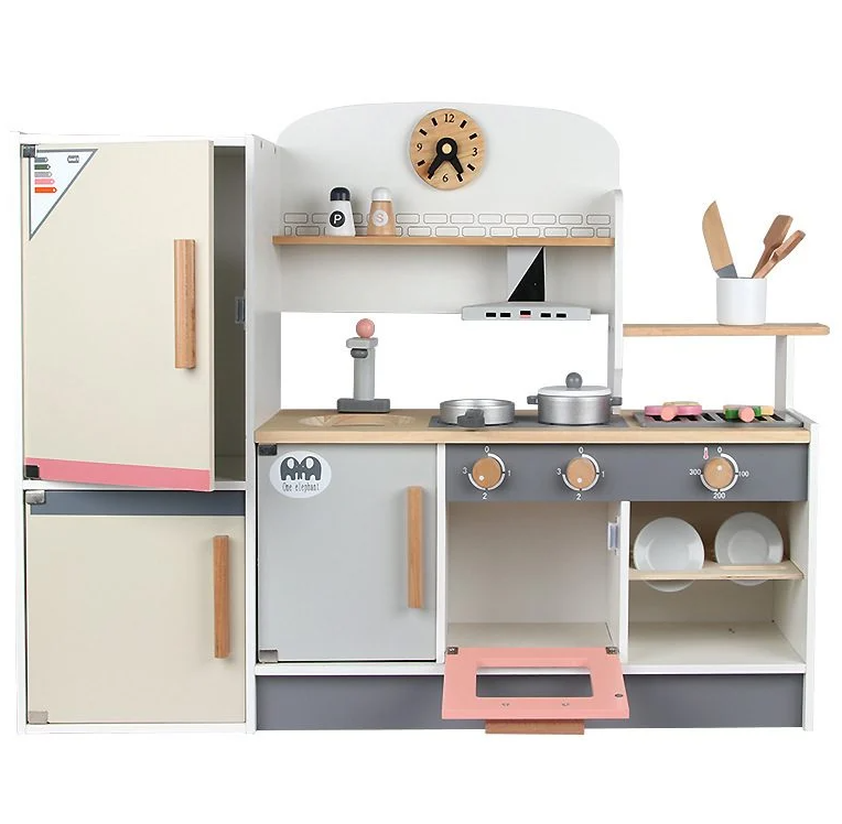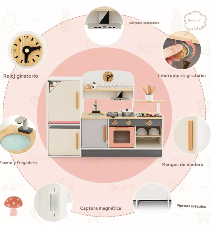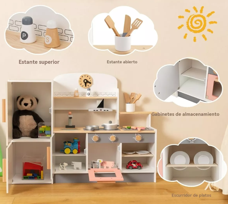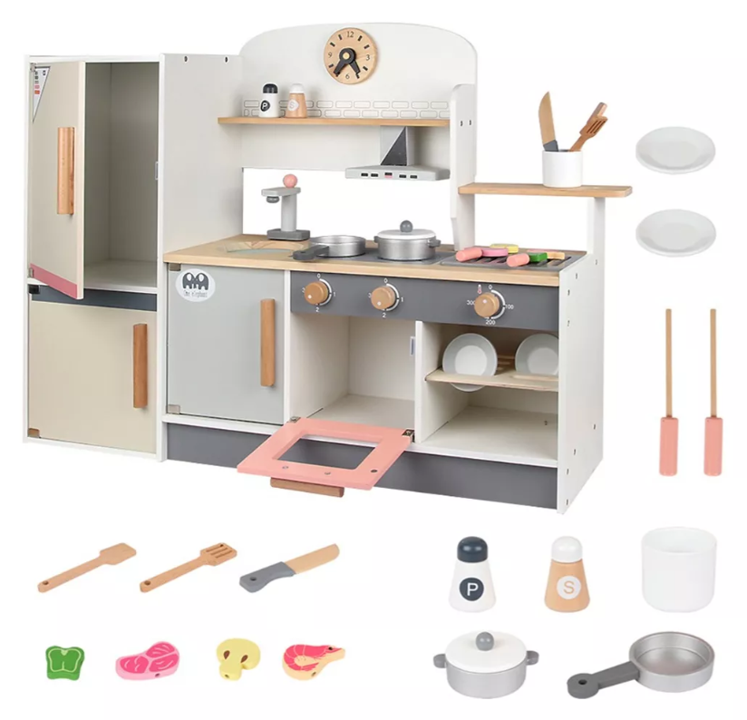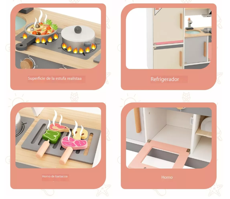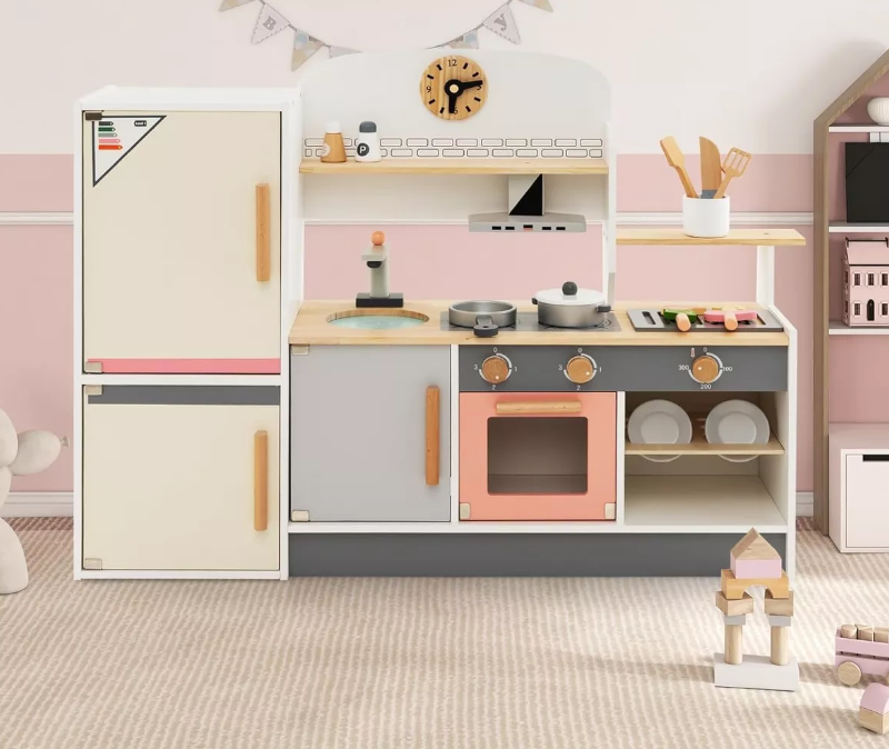 - Design realist: Cuptor cu ușă rabatabilă, aragaz cu butoane rotative, chiuvetă cu robinet și un frigider cu ușă, oferind copiilor oportunitatea de a simula toate activitățile dintr-o bucătărie adevărată.