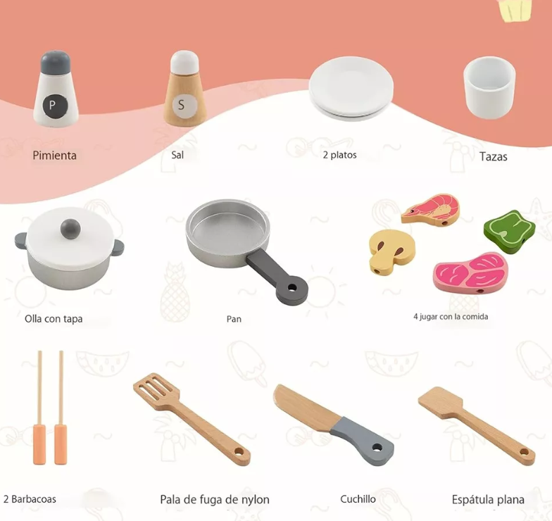 - Set complet de ustensile: Include farfurii, tacâmuri, oale, tigăi, alimente de jucărie (legume, carne, creveți) și alte accesorii necesare pentru o bucătărie complet echipată.