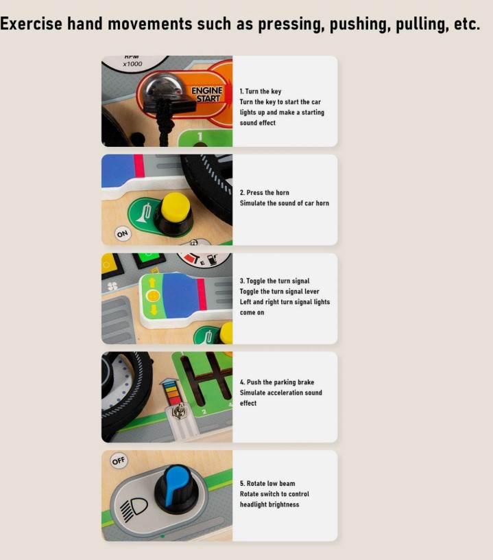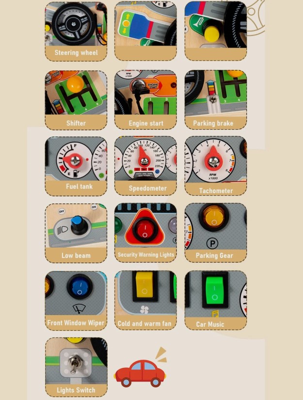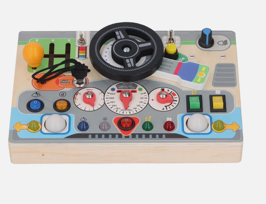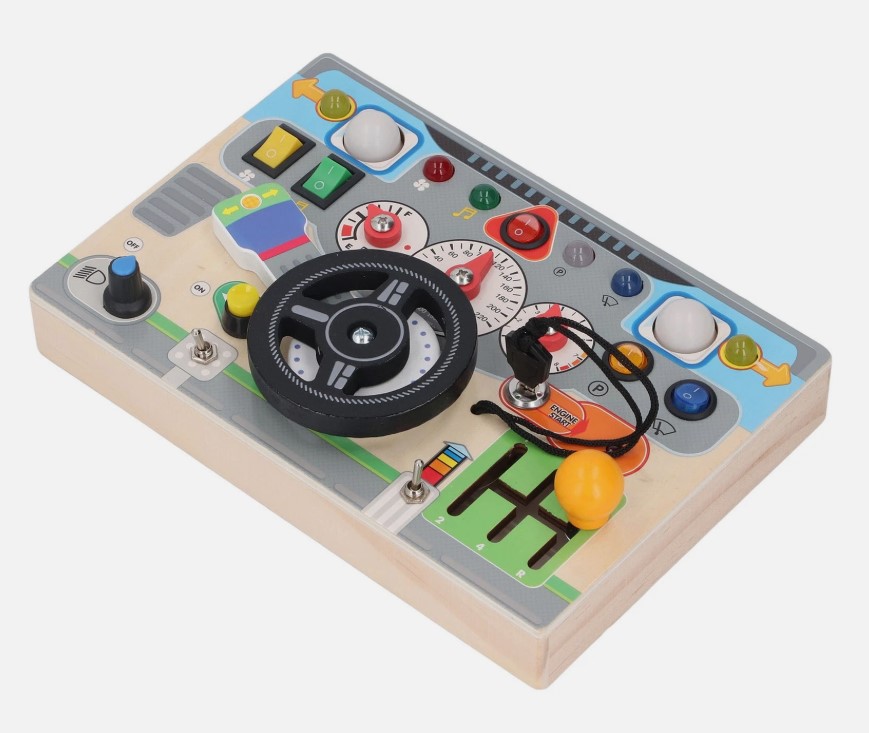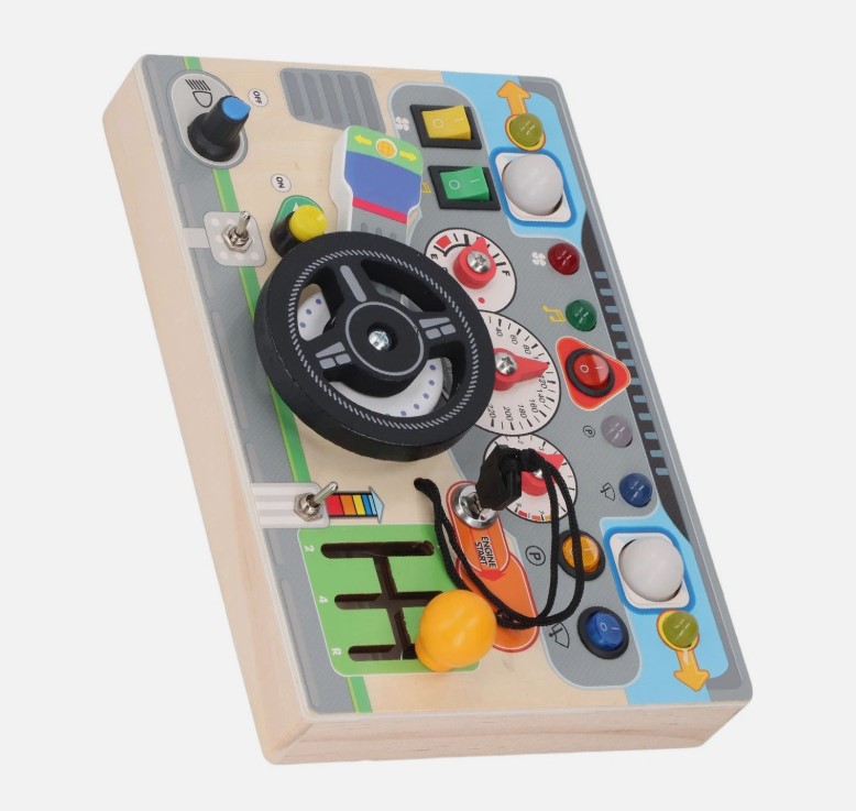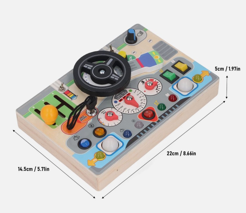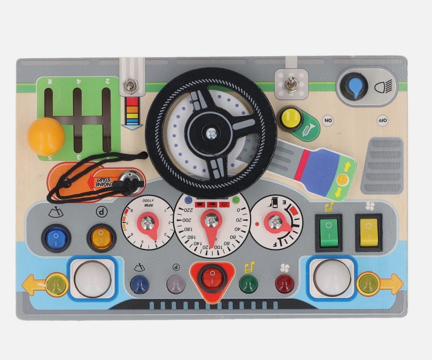 Un panou educativ complet, care reproduce în miniatură bordul unei mașini reale, cu o varietate de butoane, comutatoare, roți și elemente interactive care imită funcțiile din viața reală. Busy Board-ul tematic „Electricitatea” este ideal pentru dezvoltarea dexterității, a coordonării mână-ochi și a logicii prin joacă activă.