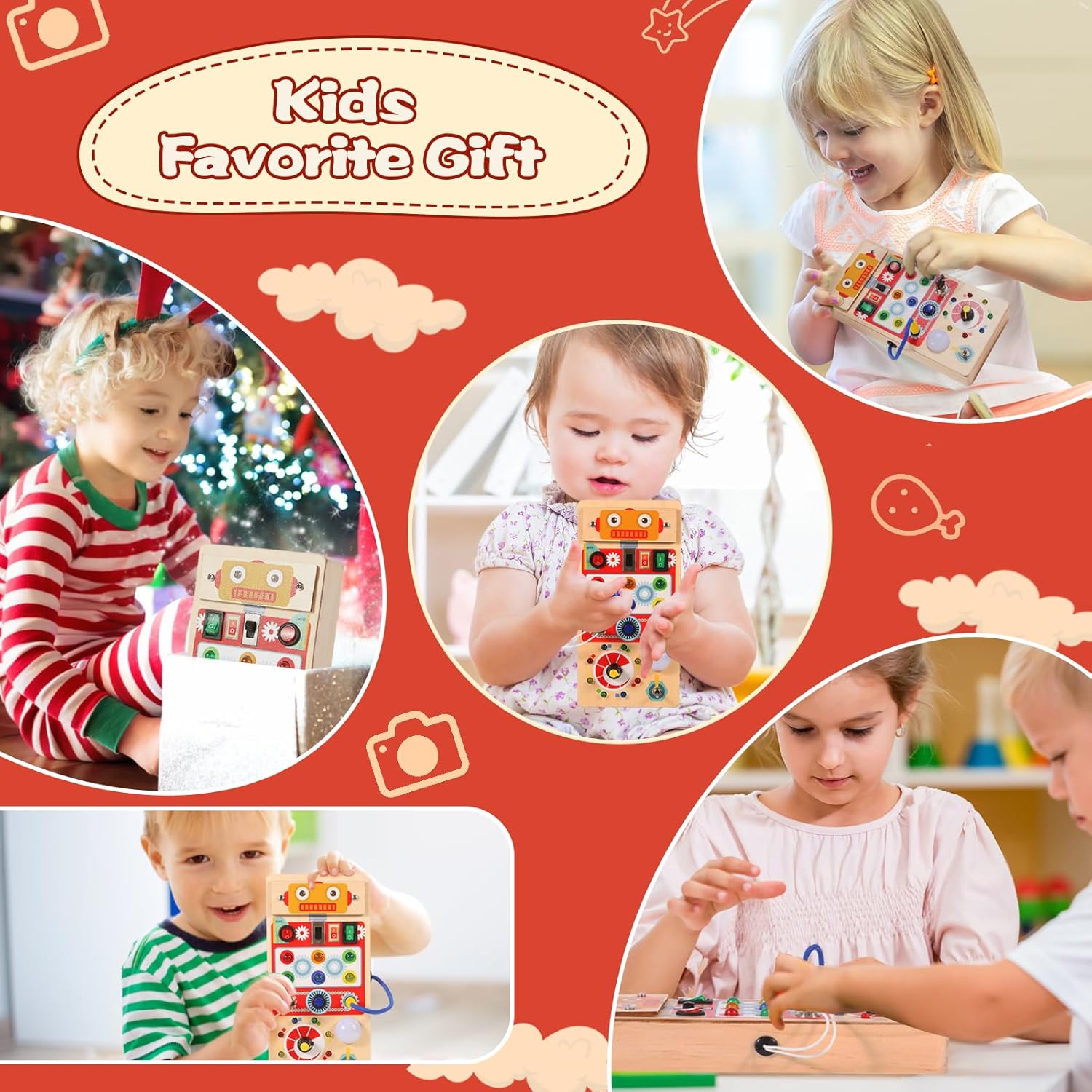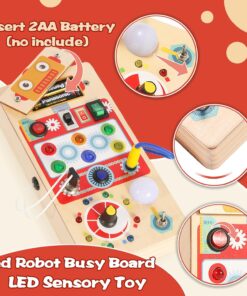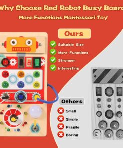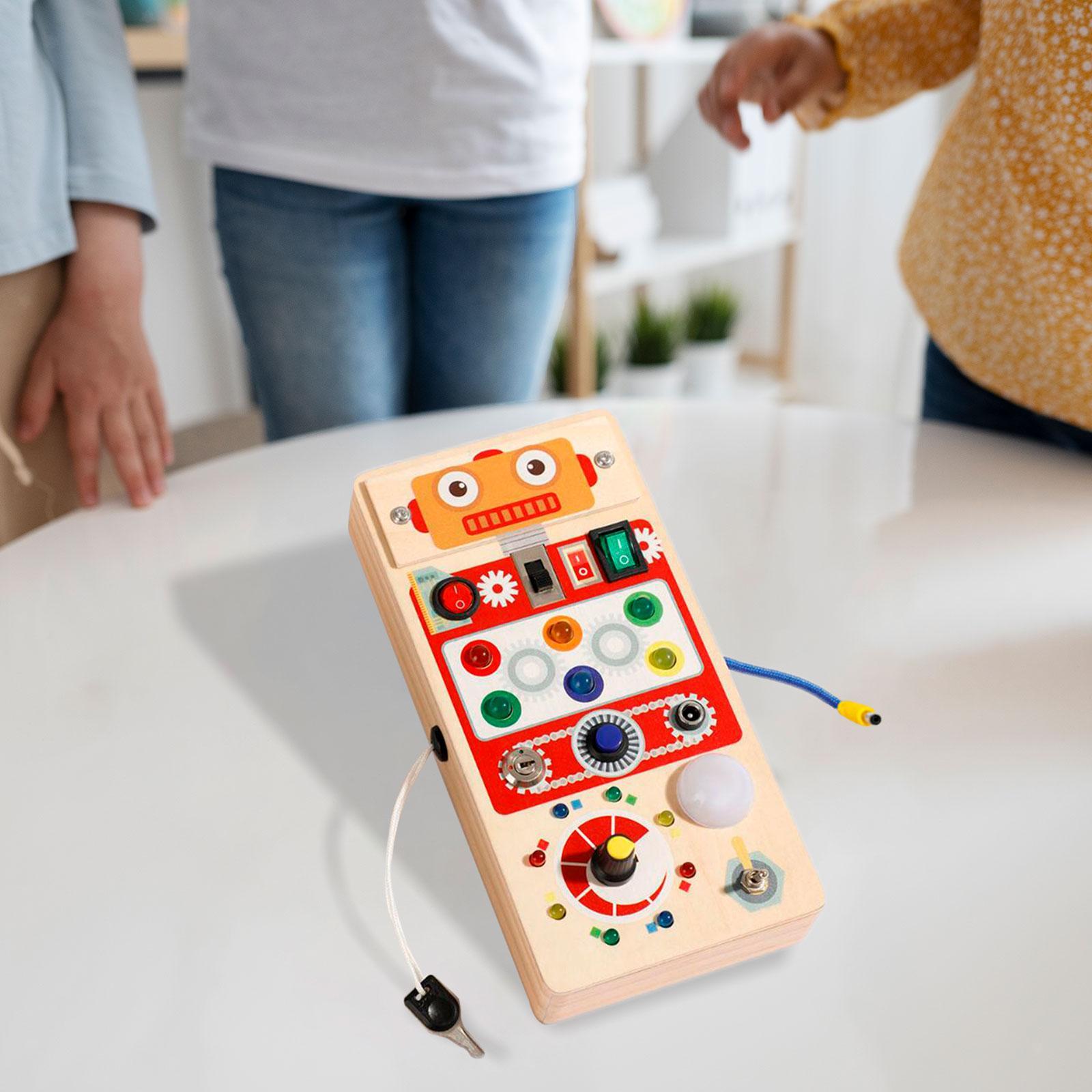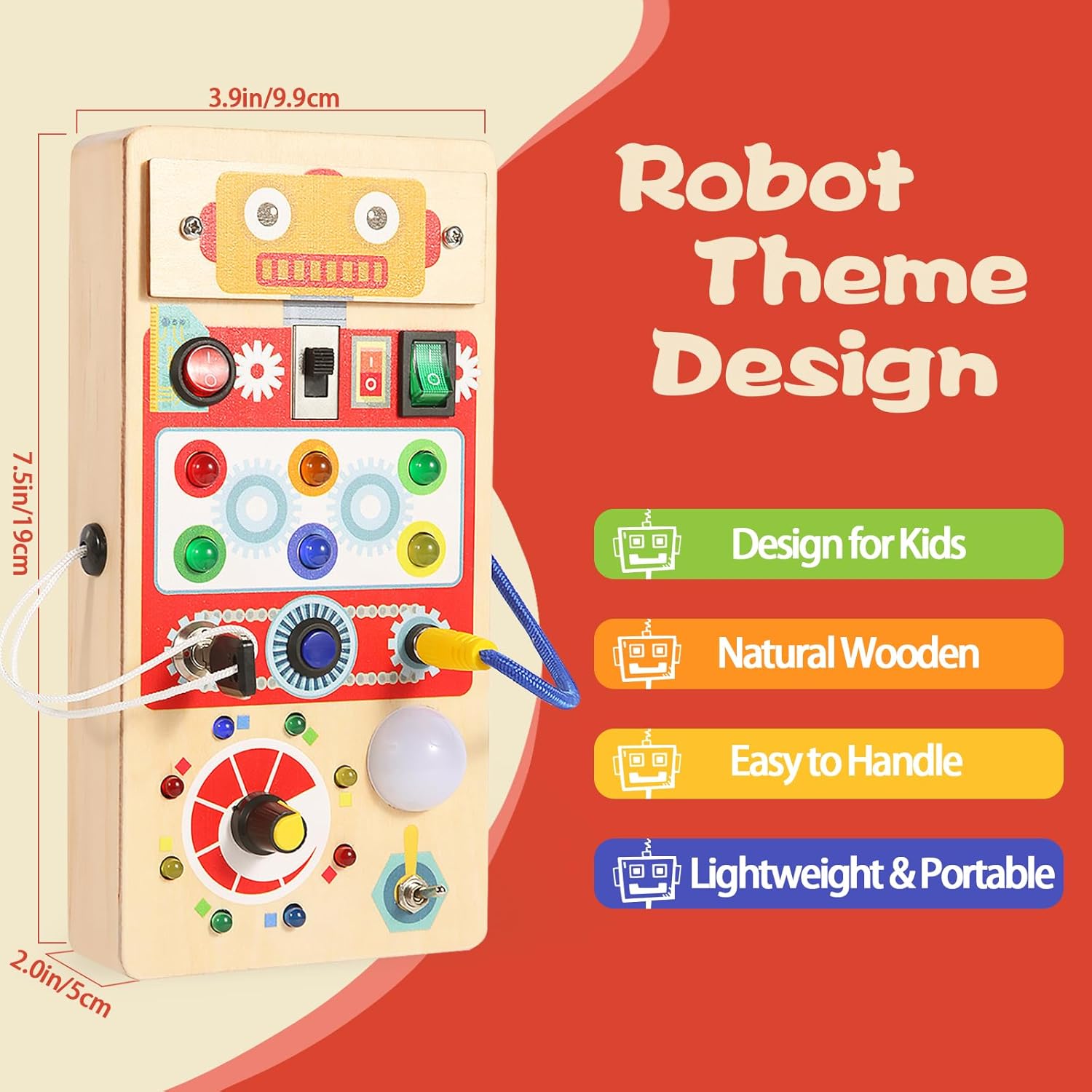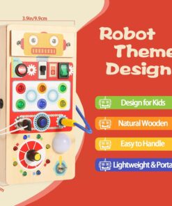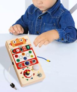 Busy Board-ul electric în formă de robot de la Onshine este o jucărie educativă Montessori, creată special pentru a stimula curiozitatea și dezvoltarea abilităților practice ale copiilor. Conceput sub formă de panou interactiv cu numeroase butoane, comutatoare, lumini LED și elemente mecanice, acest busy board le oferă celor mici ocazia să descopere, să învețe și să își dezvolte coordonarea într-un mod sigur și distractiv.
