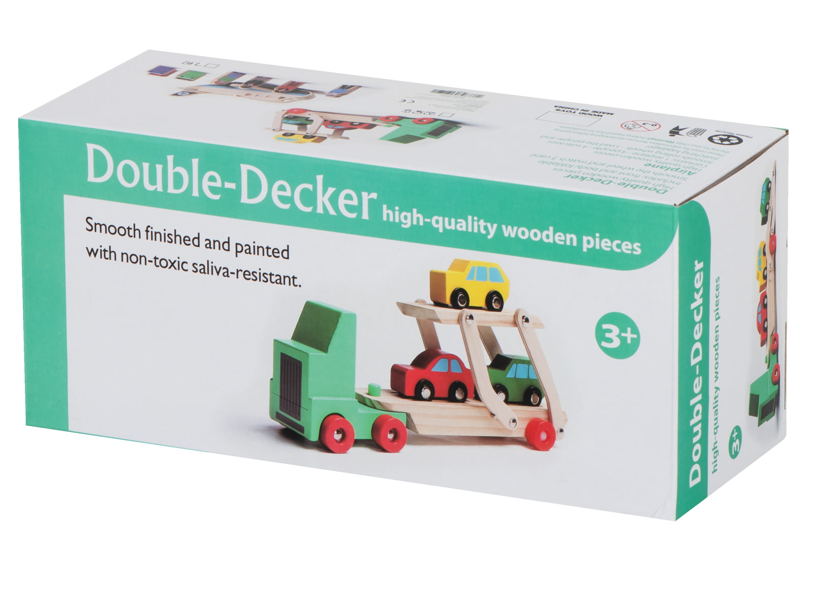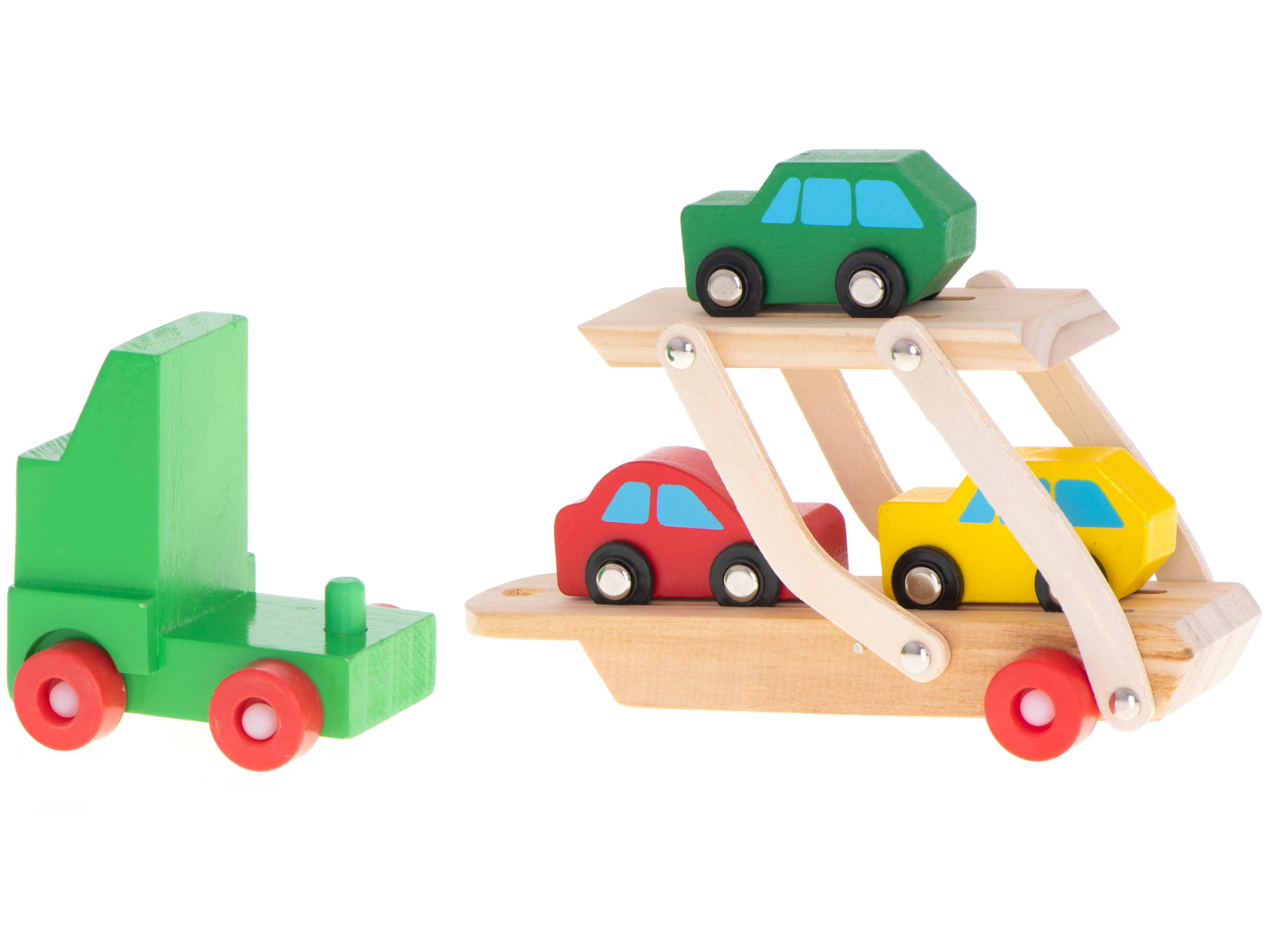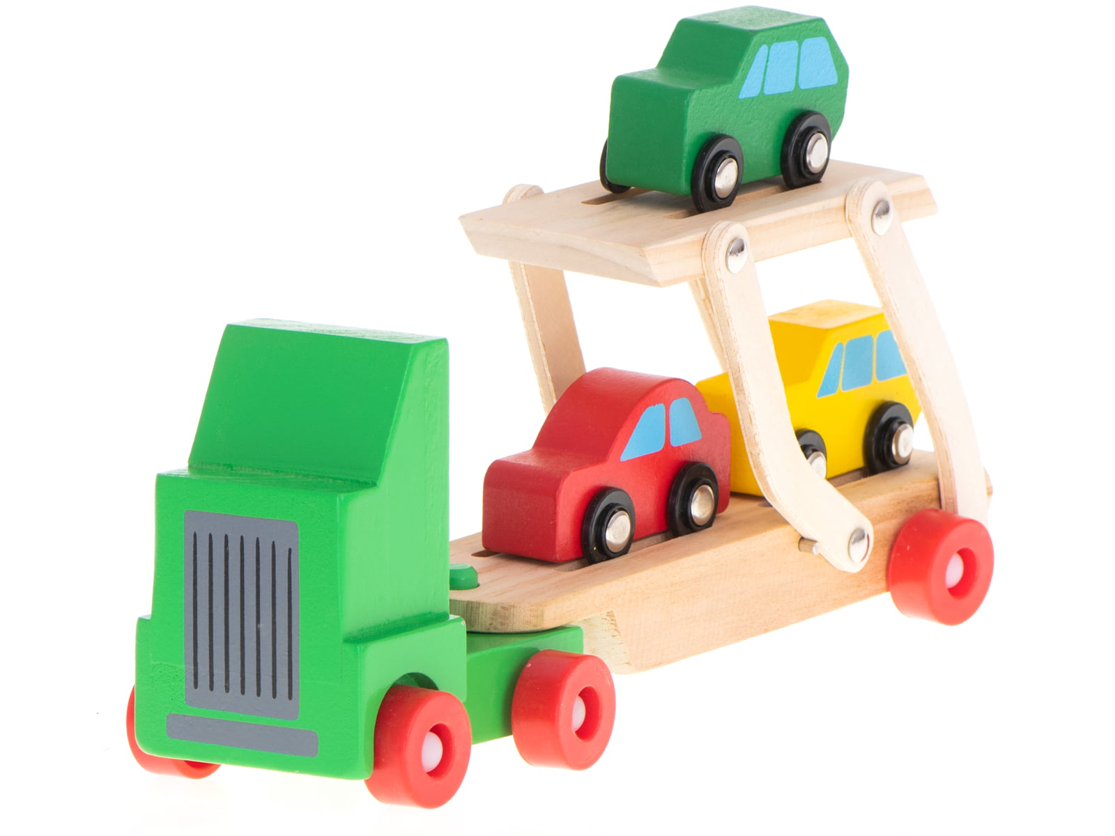 Masina din lemn Camion transportator din lemn cu 3 masinute pentru baietei este formata dintr-un camion supraetajat cu 3 masinute din diferite culori.