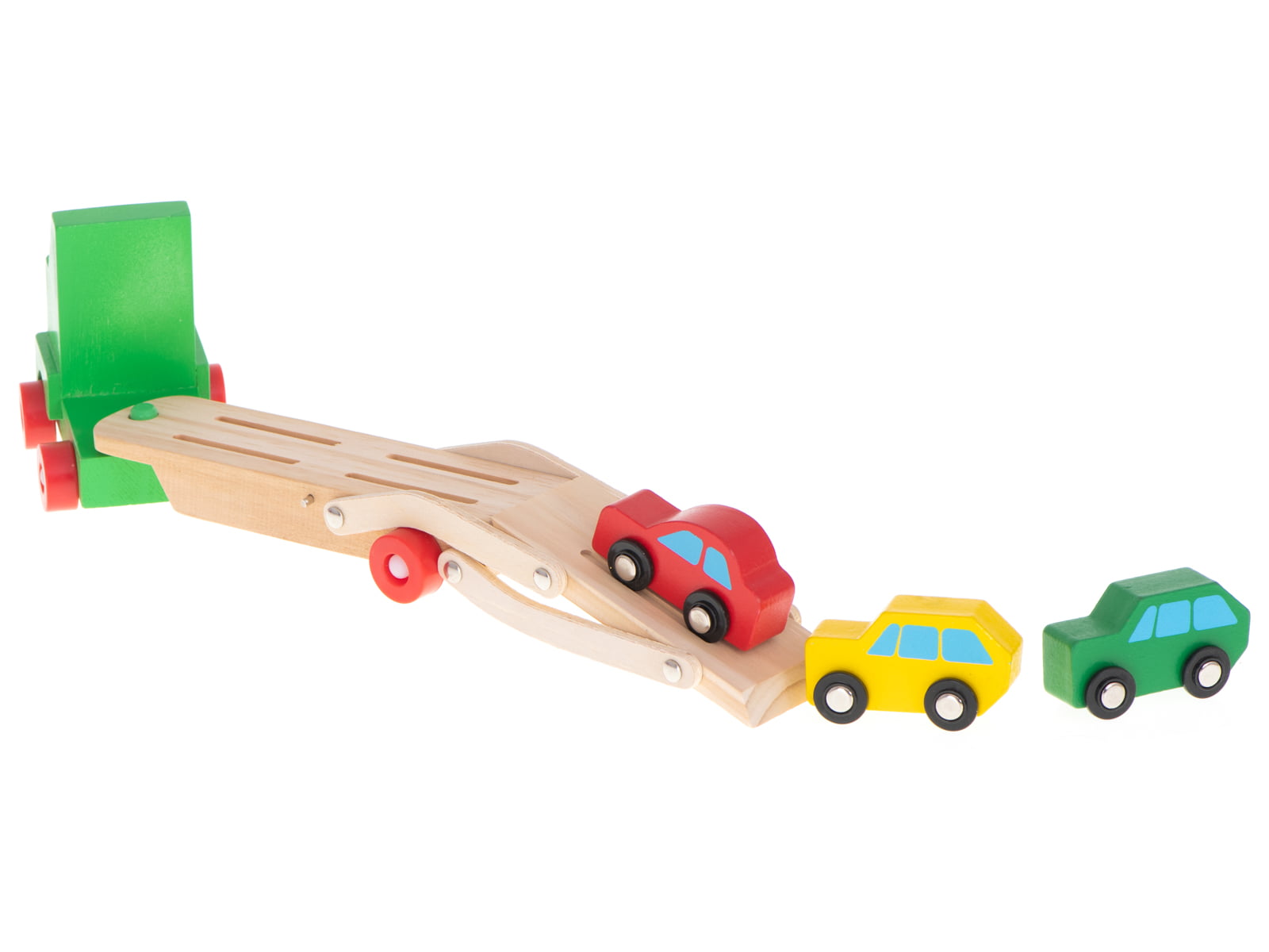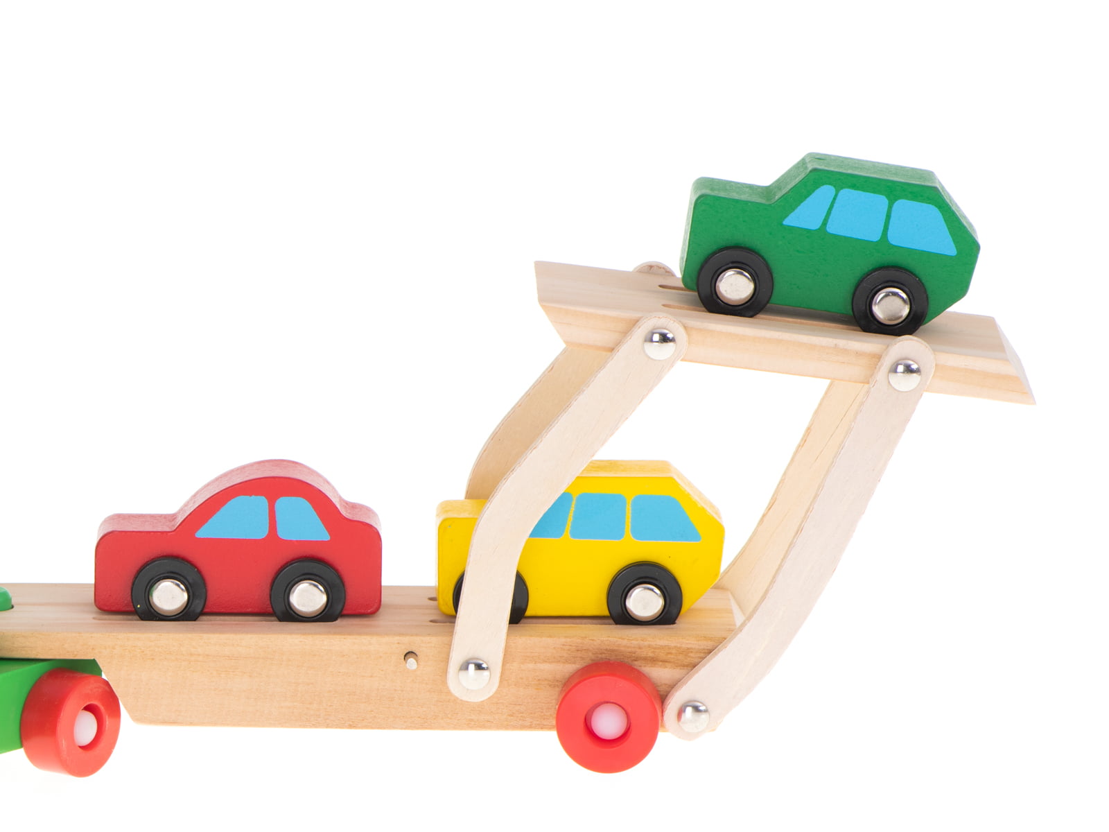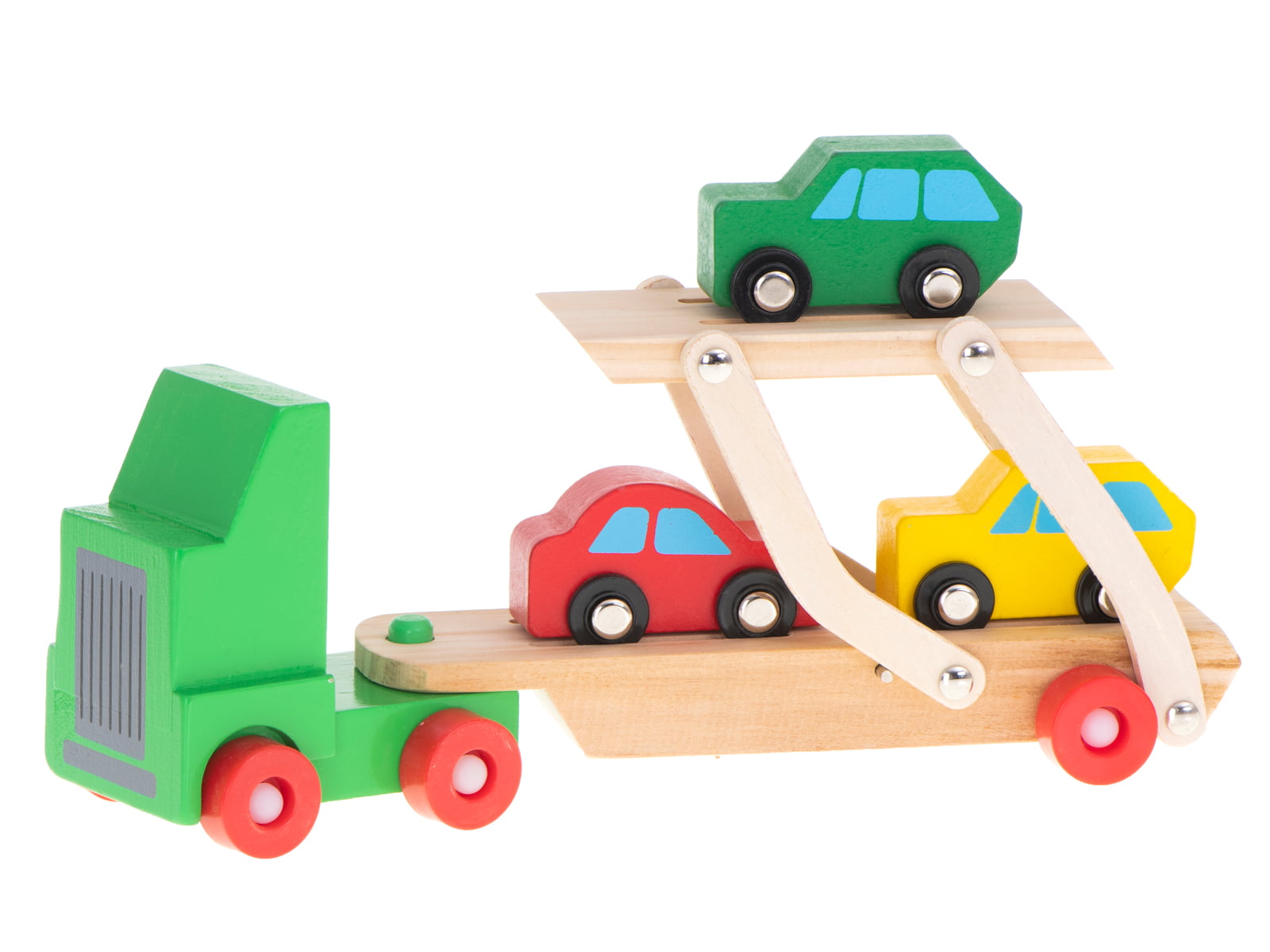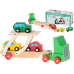 Cu jucaria din lemn camion transportator cu masini copilul va putea invata culorile primare, va putea face jocuri de rol si isi va dezvolta limbajul.