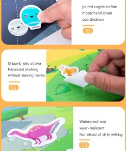 Copilul poate plasa stickerele cu dinozauri pe fundalul ilustrat al cărții, explorând scenele cu vulcani, peșteri și jungle tropicale. Stickerele pot fi repoziționate de nenumărate ori, oferind o experiență interactivă și mereu diferită.