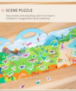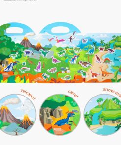Tematică: Explorarea lumii preistorice — scene colorate cu vulcani, peșteri, păduri tropicale și munți acoperiți de zăpadă, în care copiii pot plasa dinozauri carnivori, erbivori și zburători precum Tyrannosaurus, Triceratops, Stegosaurus, Pterodactyl și alții.