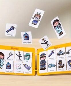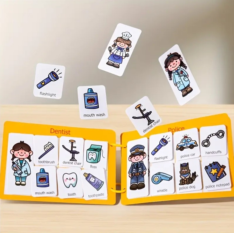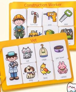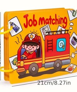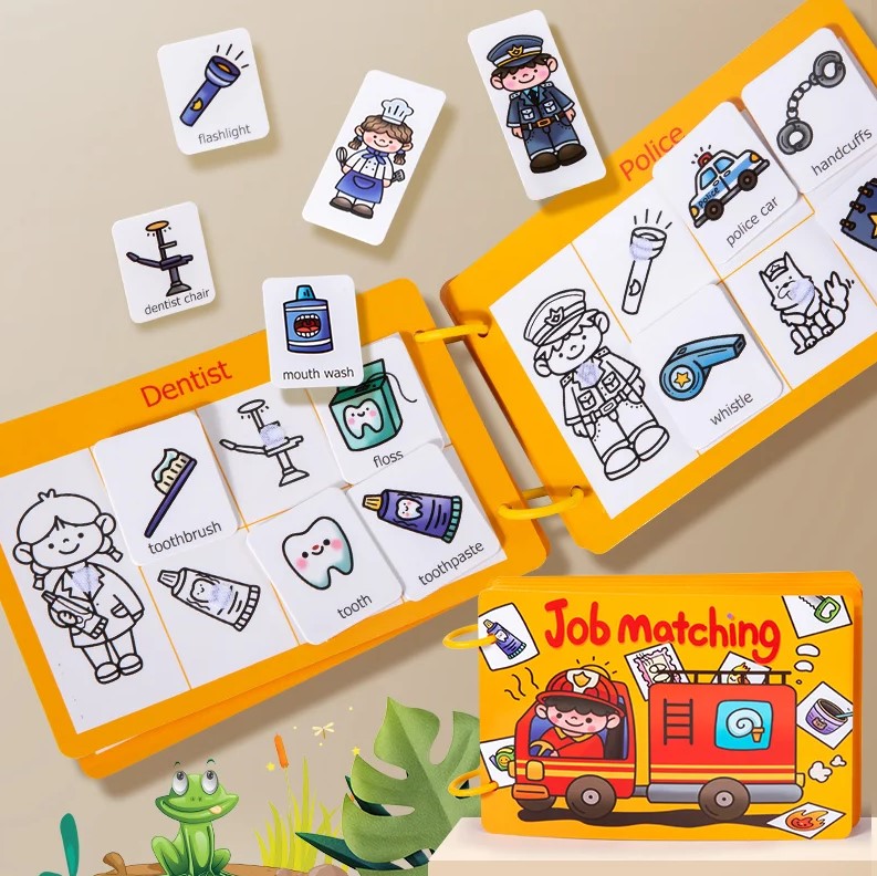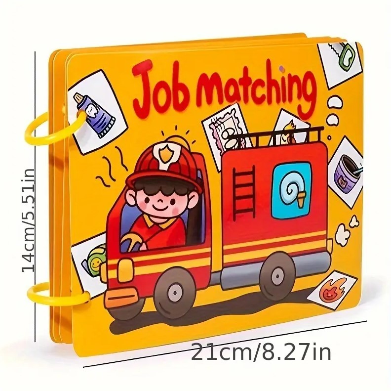 Această carte interactivă este perfectă pentru micii exploratori curioși să învețe despre lumea adulților și meseriile acestora. Concepută sub forma unui Busy Book cu stickere velcro detașabile și refolosibile, cartea ajută copiii să asocieze fiecare personaj cu obiectele specifice meseriei sale într-un mod jucăuș și educativ.