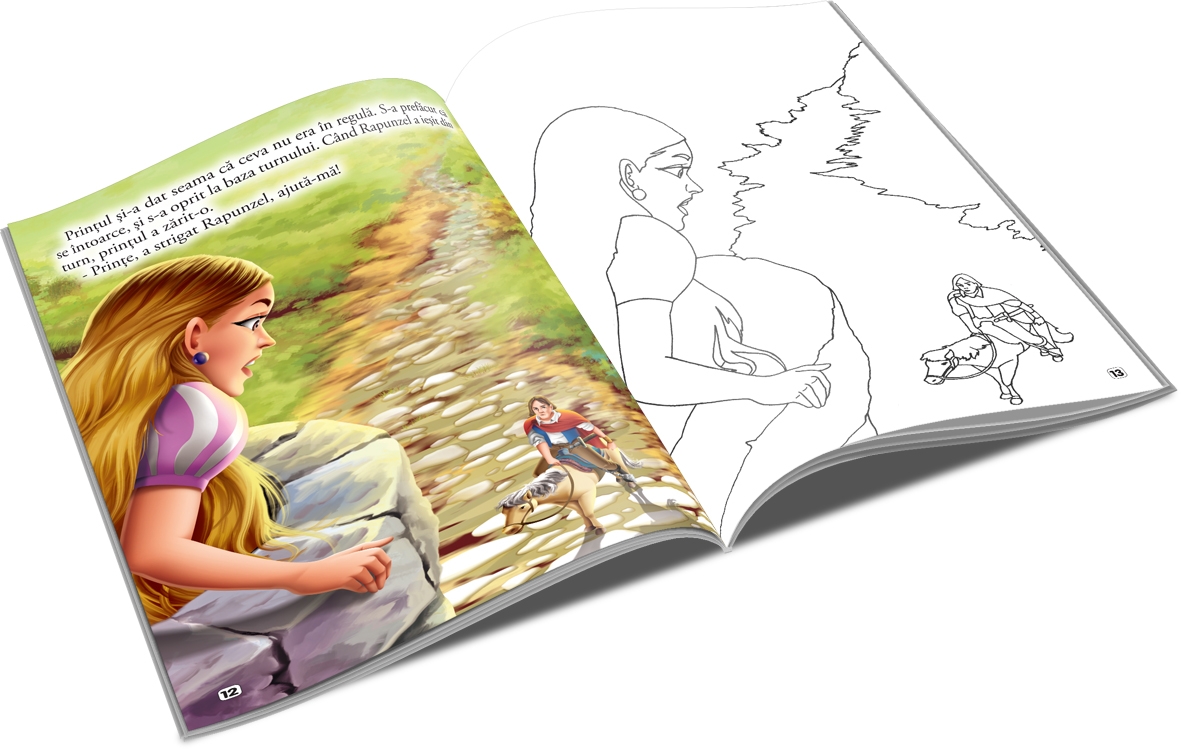 Fiecare pagină este ilustrată cu atenție la detalii, oferind copiilor oportunitatea de a da viață scenei îmbietoare prin colorare. De la pletele lungi și aurii ale Rapunzel, până la grădina secretă din jurul turnului, fiecare imagine captivează imaginația și stimulează creativitatea.