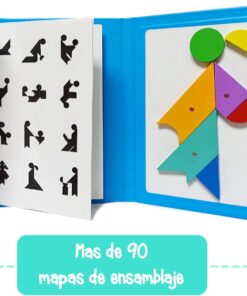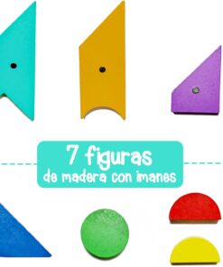 Carte magnetică tip tangram concepută pentru a stimula creativitatea și gândirea logică a copiilor prin activități practice și atractive. Setul include 7 piese geometrice din lemn prevăzute cu magneți, ușor de manevrat și de poziționat pe suprafața magnetică a cărții.