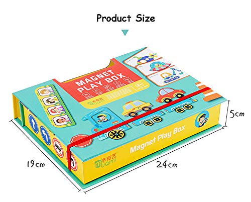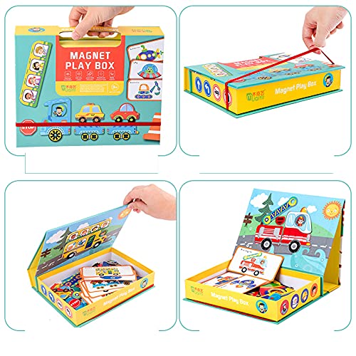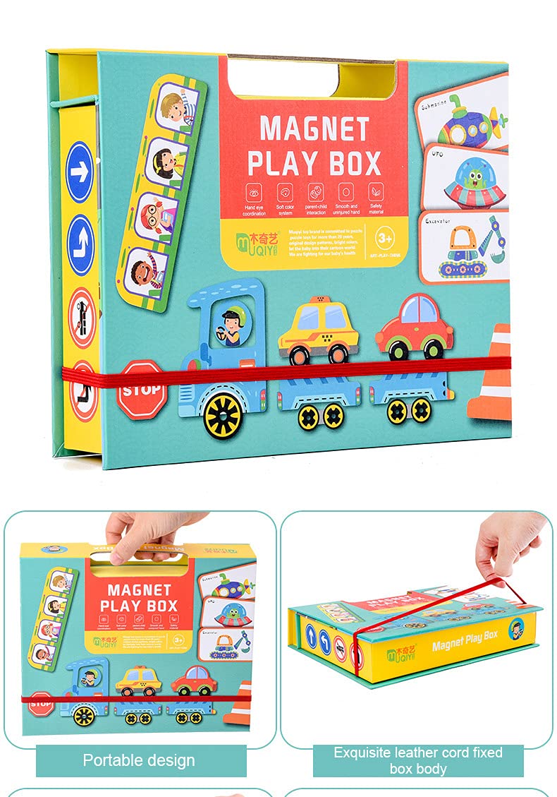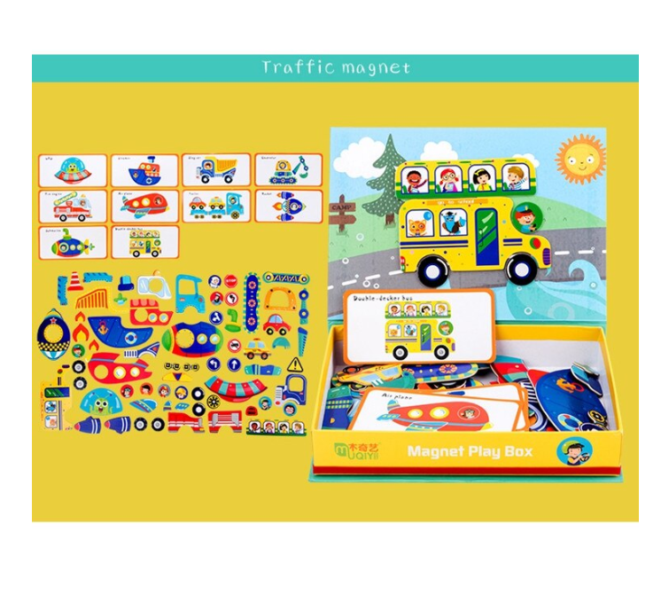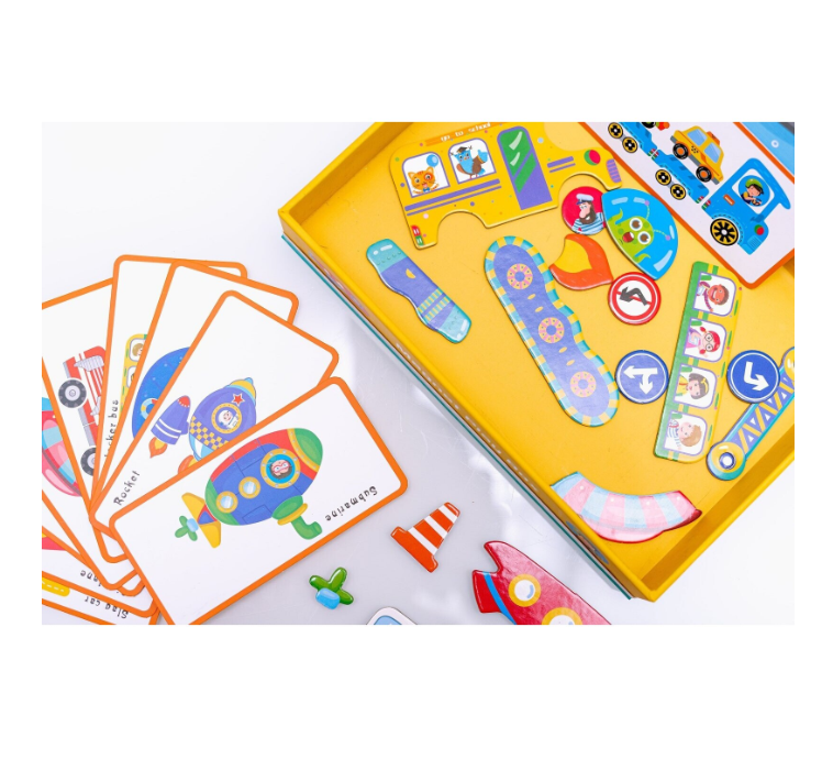 • Set complet: Vine cu multiple piese magnetice și carduri ilustrate cu diverse vehicule (autobuze, rachete, bărci etc.), toate însoțite de o tablă magnetică pliabilă pe care copiii pot aranja piesele.