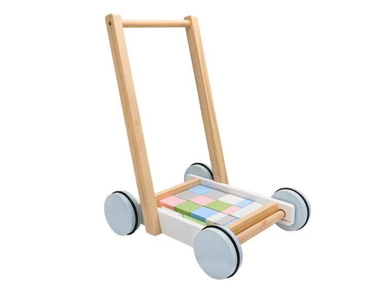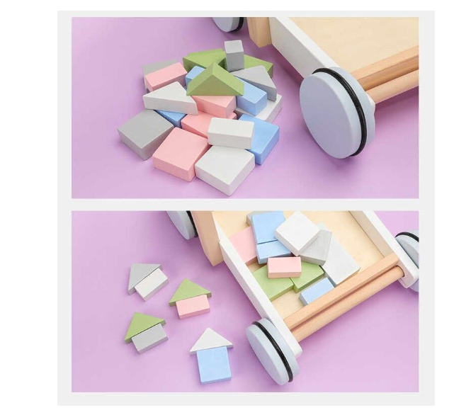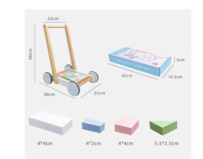 - Design multifuncțional: Include un cărucior din lemn natural, robust, cu mânere ergonomice și 20 de cuburi din lemn în culori pastelate.