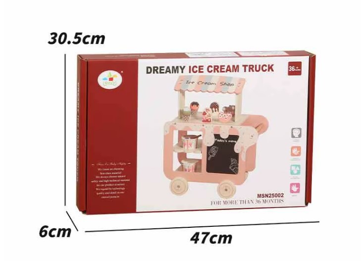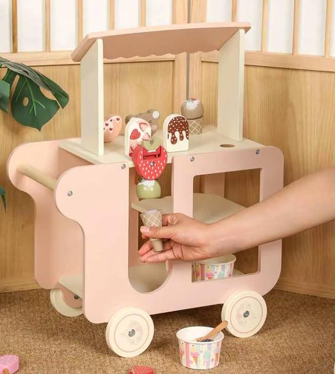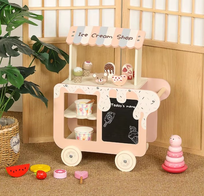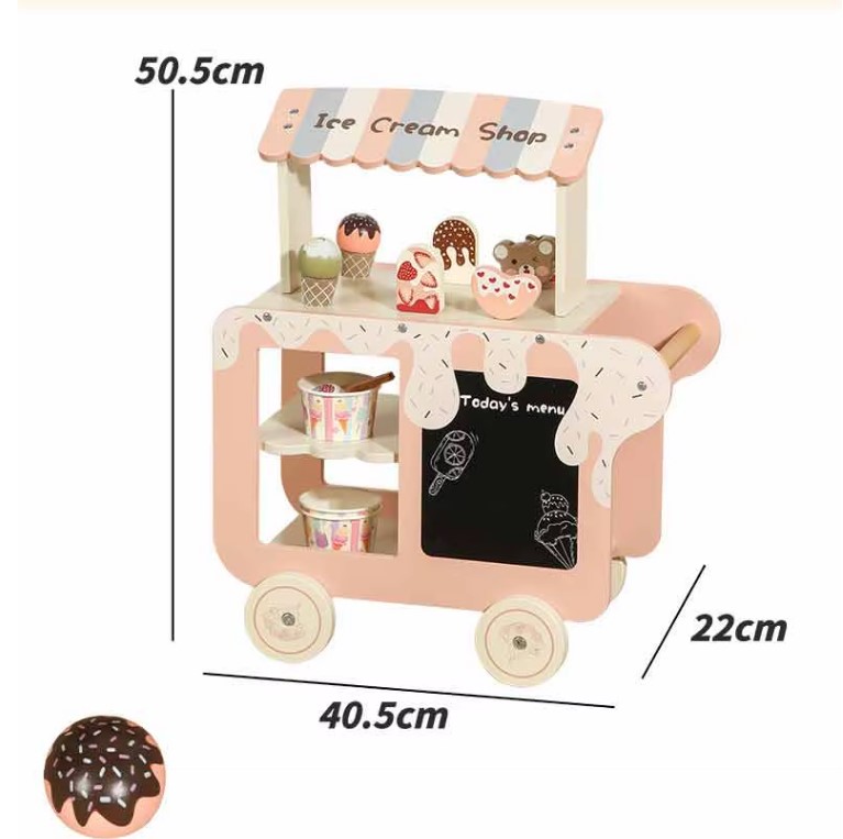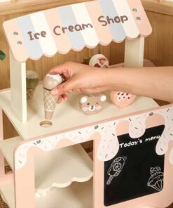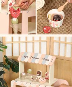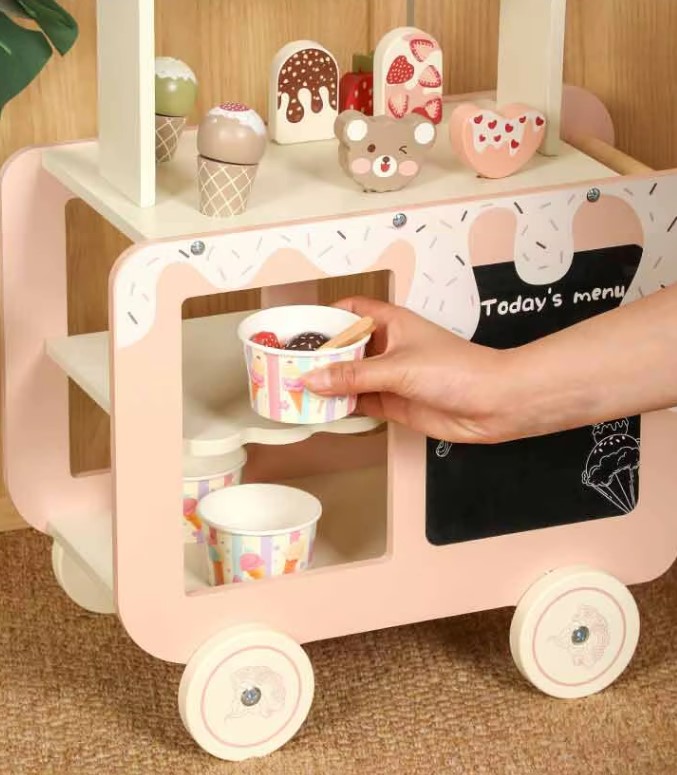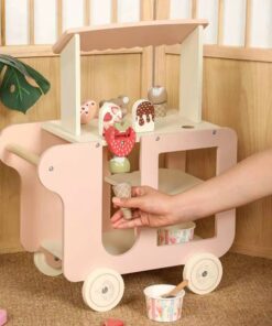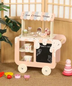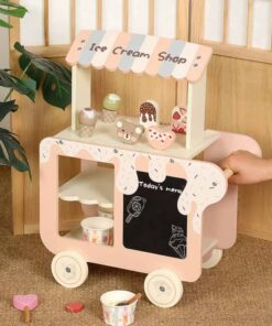 Căruțul din lemn tip stand de înghețată este o jucărie de rol minunată, care îi invită pe cei mici să devină vânzători și clienți într-o gelaterie de poveste. Cu o înălțime de 50 cm și un design pastelat, căruțul este prevăzut cu acoperiș tip marchiză, rafturi de expunere și roți mobile, oferind o experiență realistă și distractivă.