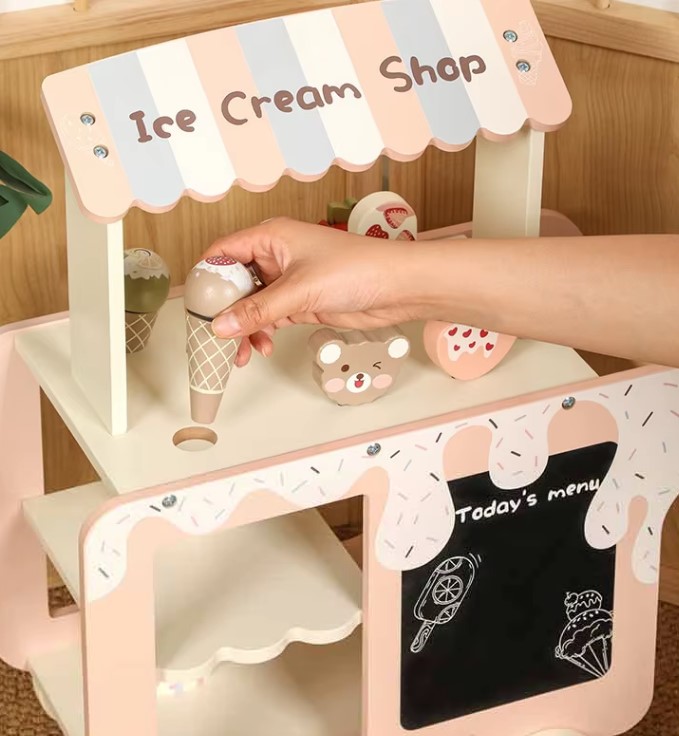 Copiii pot folosi căruțul pentru a-și organiza propria gelaterie: să așeze înghețatele pe rafturi, să servească prietenii sau părinții cu cornete și cupe de înghețată, să creeze combinații de fructe și deserturi și să noteze „meniul zilei” pe tablă.
