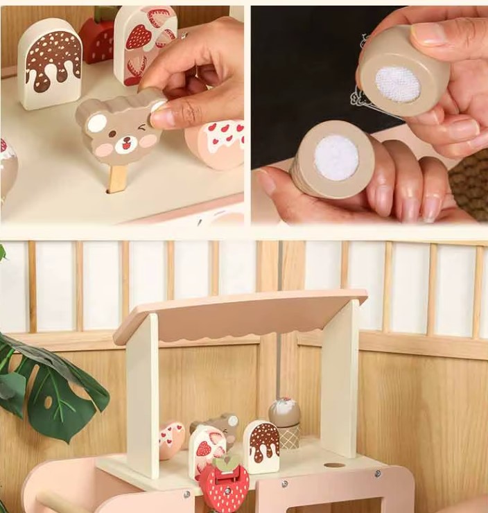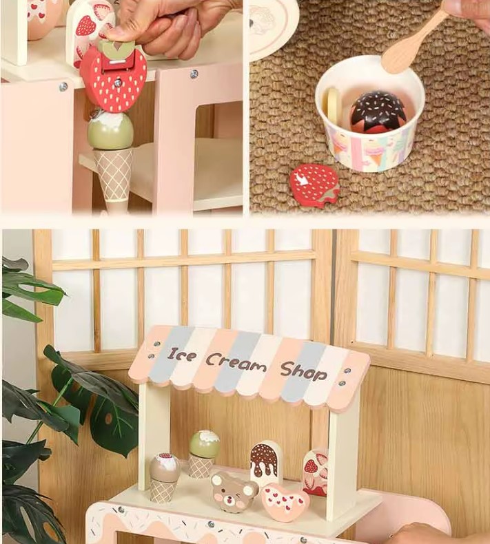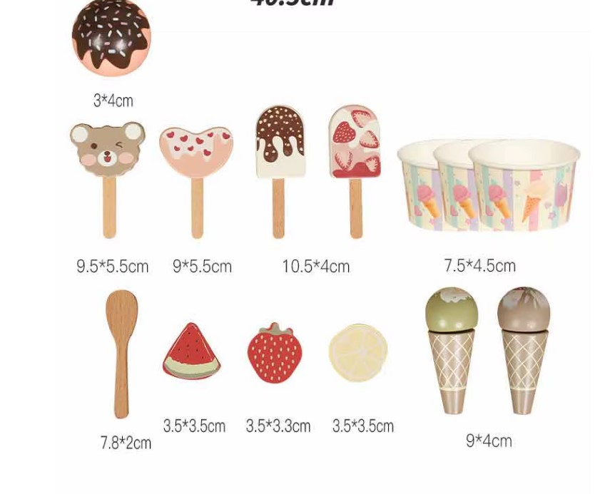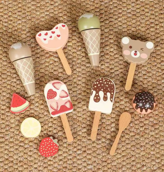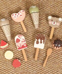 Setul include numeroase accesorii: cornete, înghețată pe băț, prăjituri, fructe, boluri și lingurițe, toate realizate din lemn de calitate, vopsite cu culori non-toxice și detalii atractive. Unele elemente se prind cu scai (velcro), ceea ce face jocul și mai interactiv.