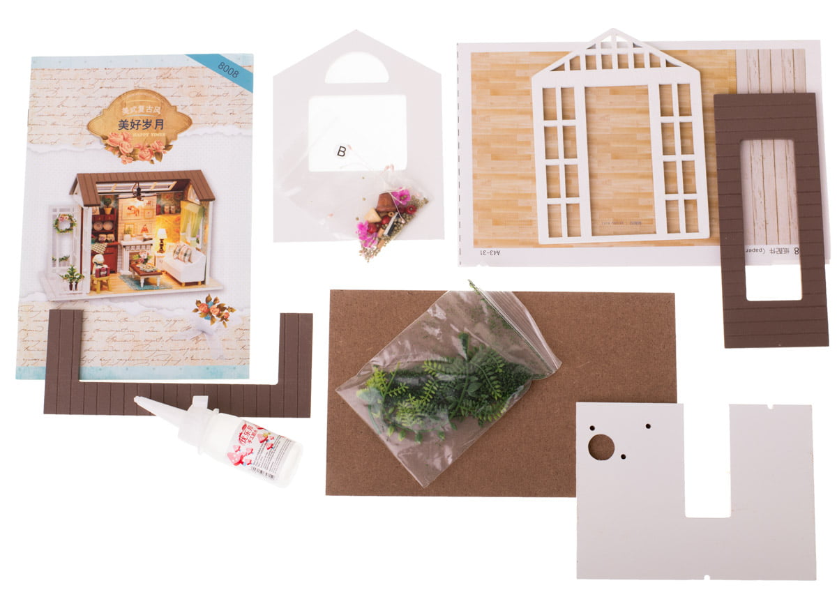 Aceasta casuta din lemn imita decorul unei camere complet mobilata, in stil retro, in miniatura. Ea contine toate elementele necesare pentru a putea simula perfect lumea adultilor, de la mobilier pana la intrerupatoare si lumini.