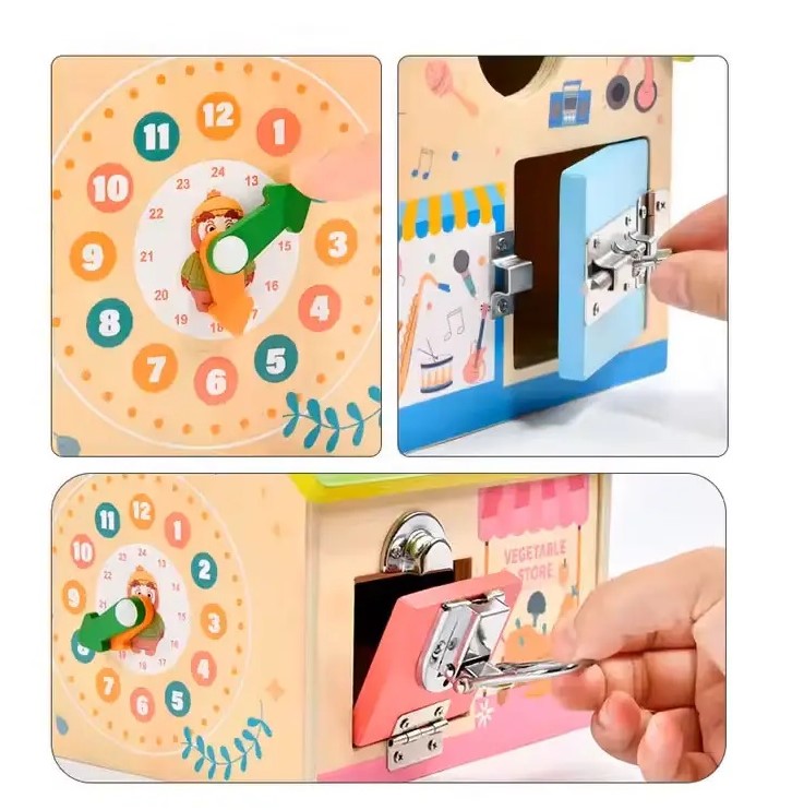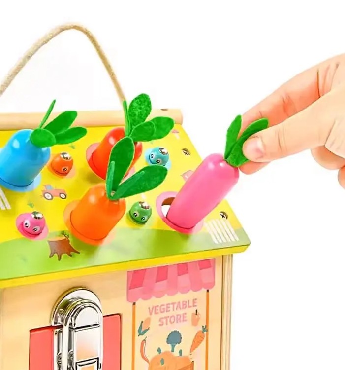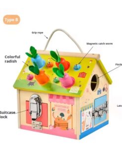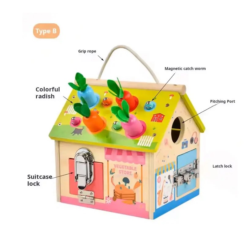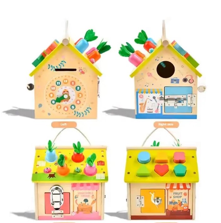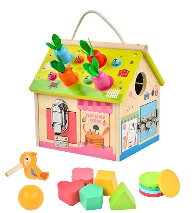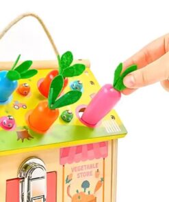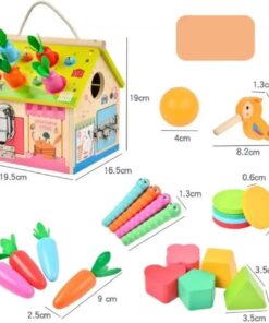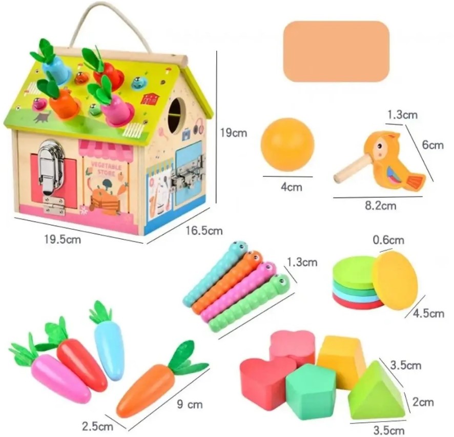 Copilul poate explora fiecare parte a căsuței: să deschidă și să închidă încuietorile, să potrivească formele geometrice, să culeagă ridichile din grădină, să rotească toba sau să introducă monede. Toate activitățile sunt concepute pentru a dezvolta autonomia, logica, coordonarea și învățarea practică prin joacă.