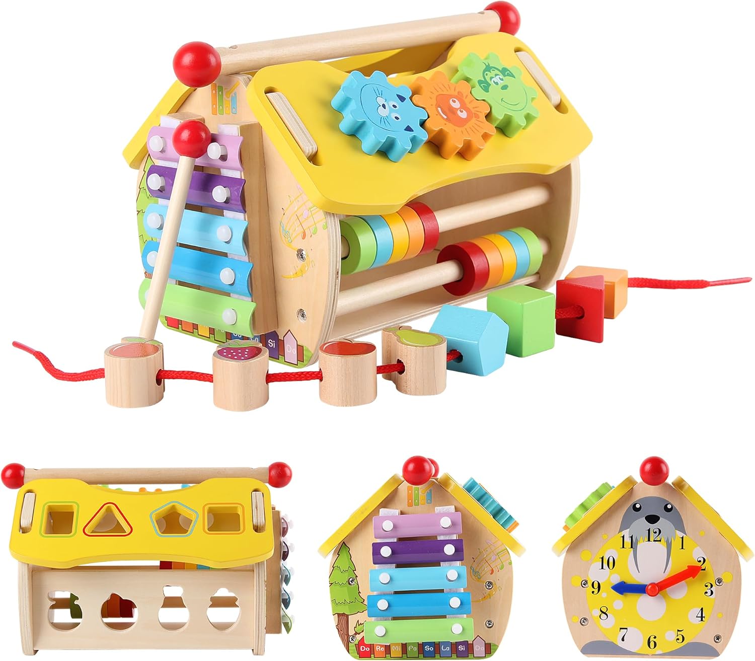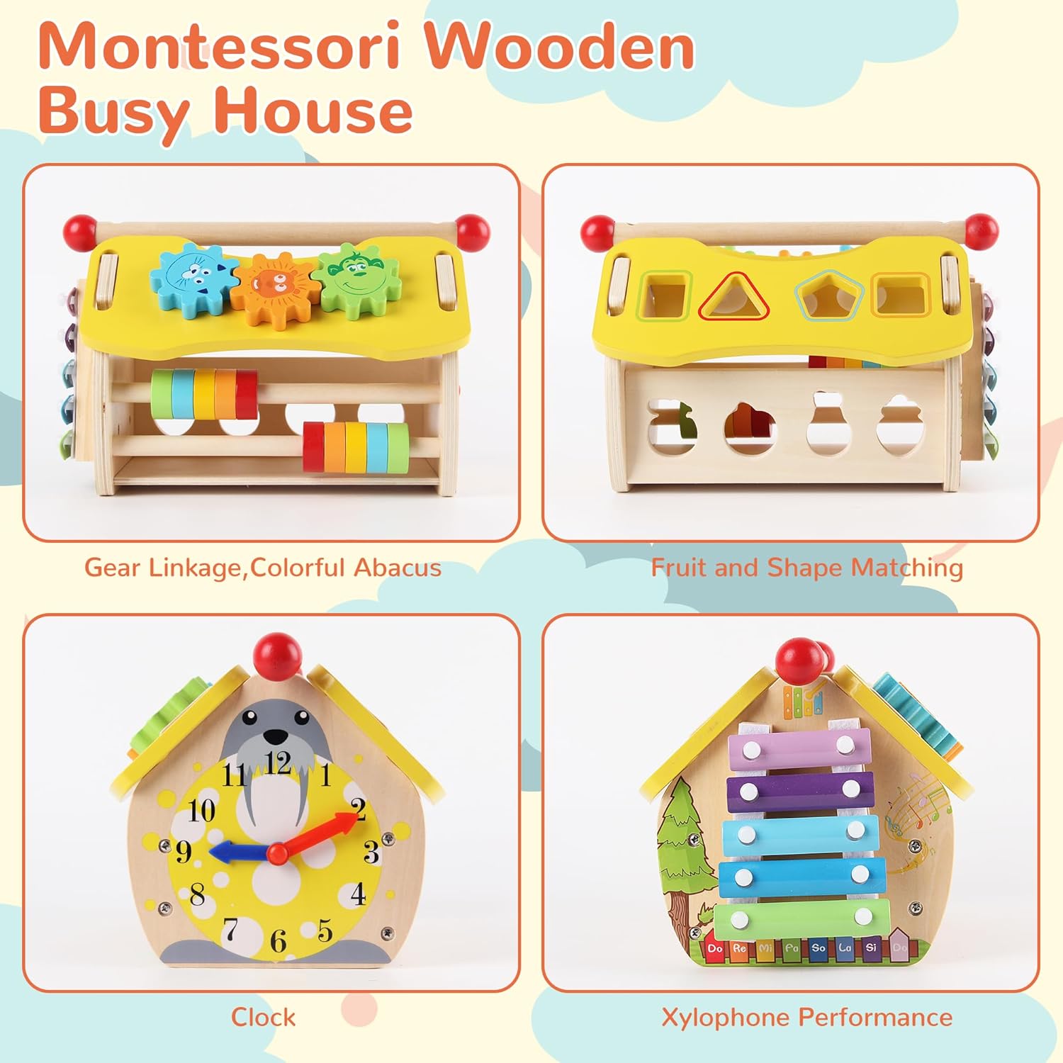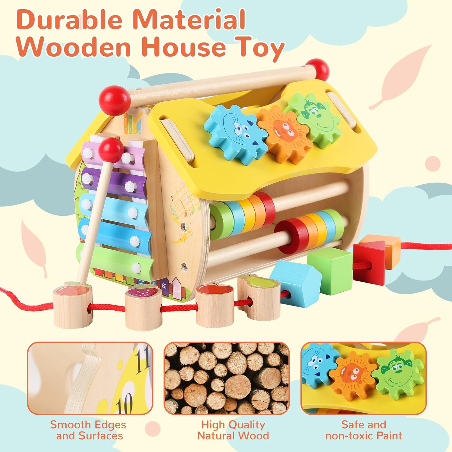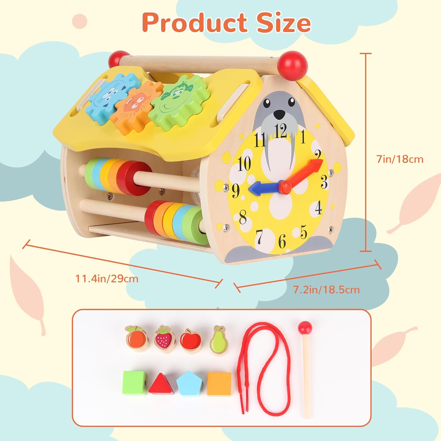 Această căsuță multifuncțională din lemn este alegerea ideală pentru copiii de peste 3 ani, combinând învățarea cu joaca interactivă. Proiectată cu o varietate de activități educative, această jucărie susține dezvoltarea abilităților cognitive și motrice ale celor mici.