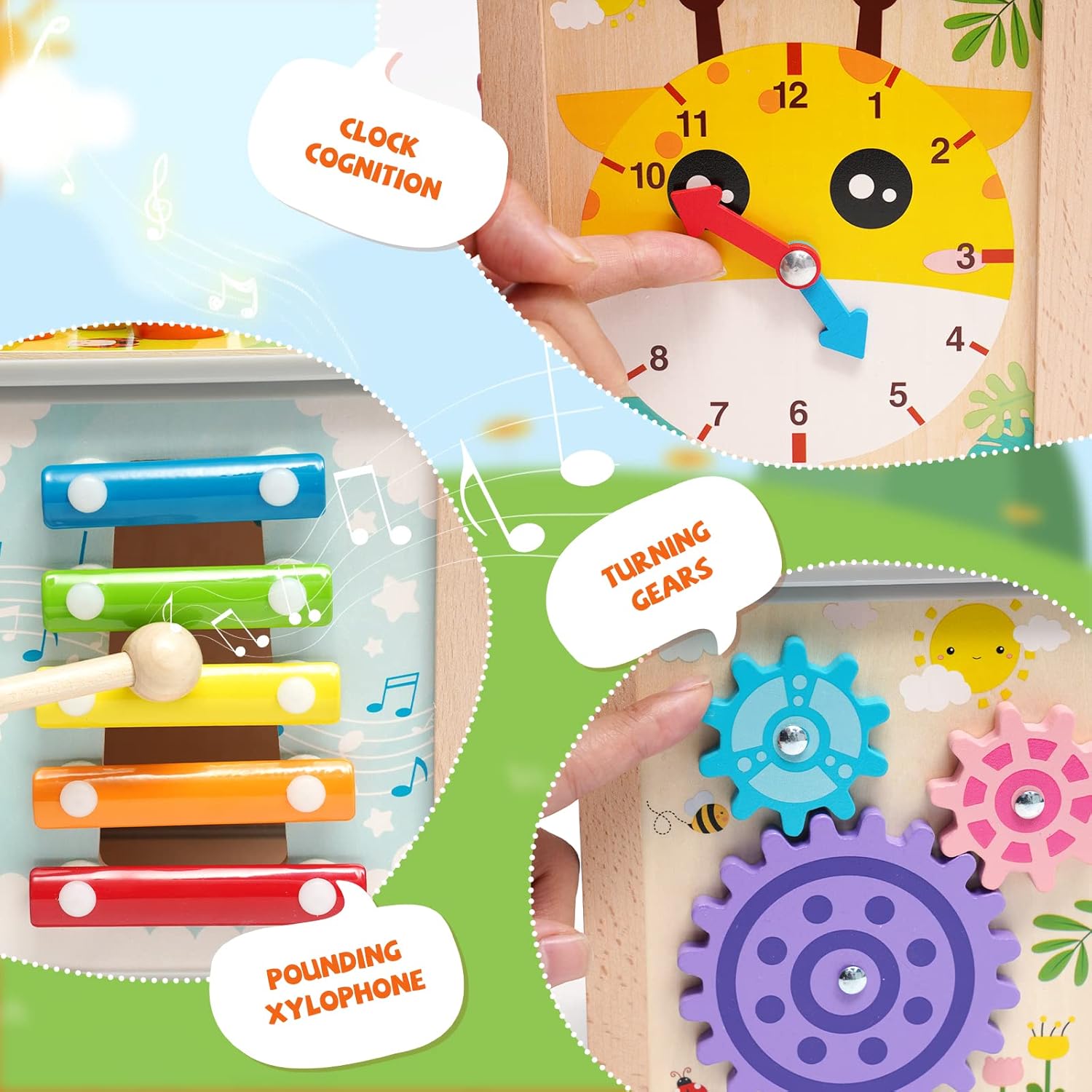 - Xilofon: Include un xilofon cu ciocănel din lemn, care dezvoltă simțul ritmic și coordonarea.