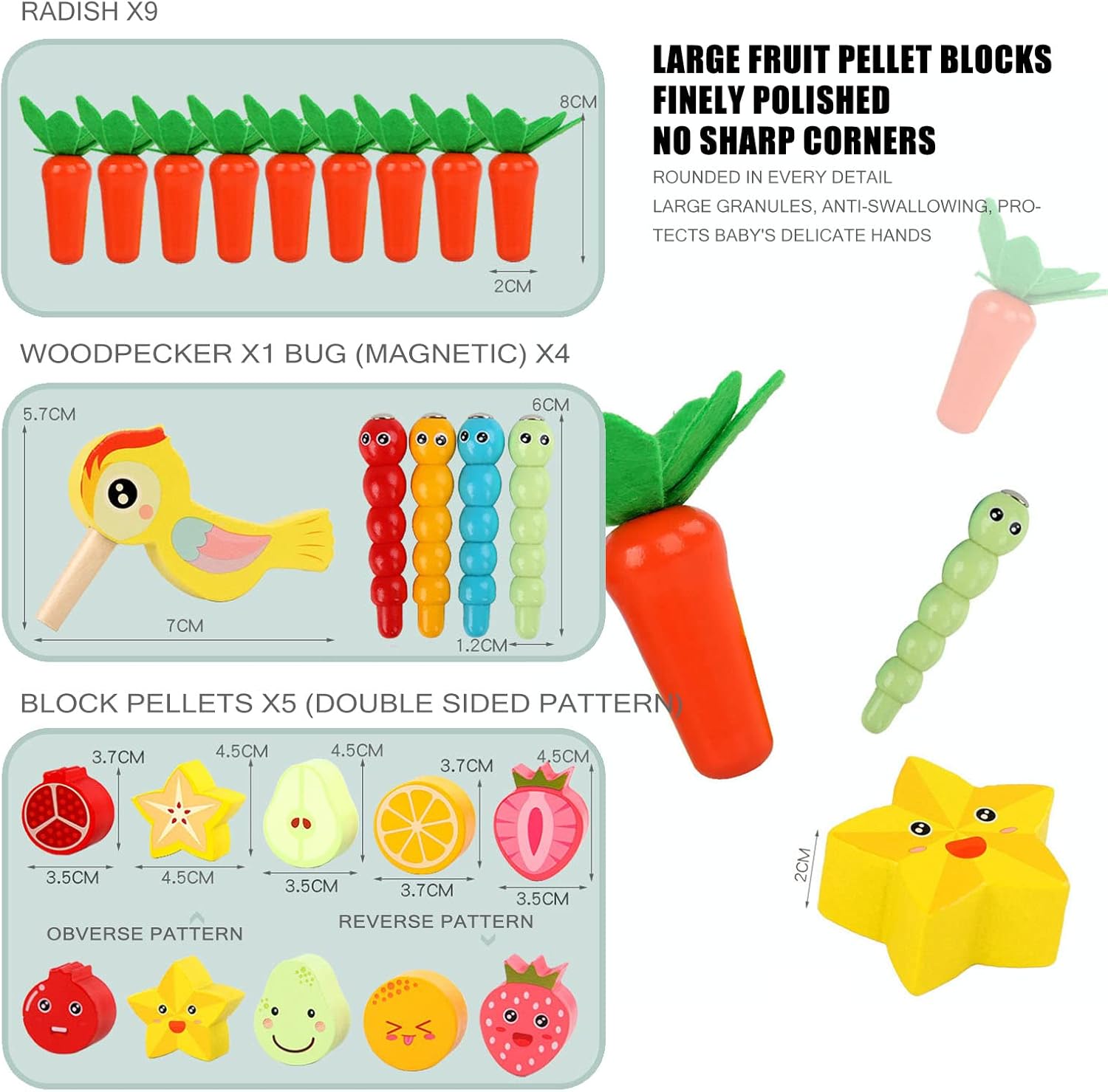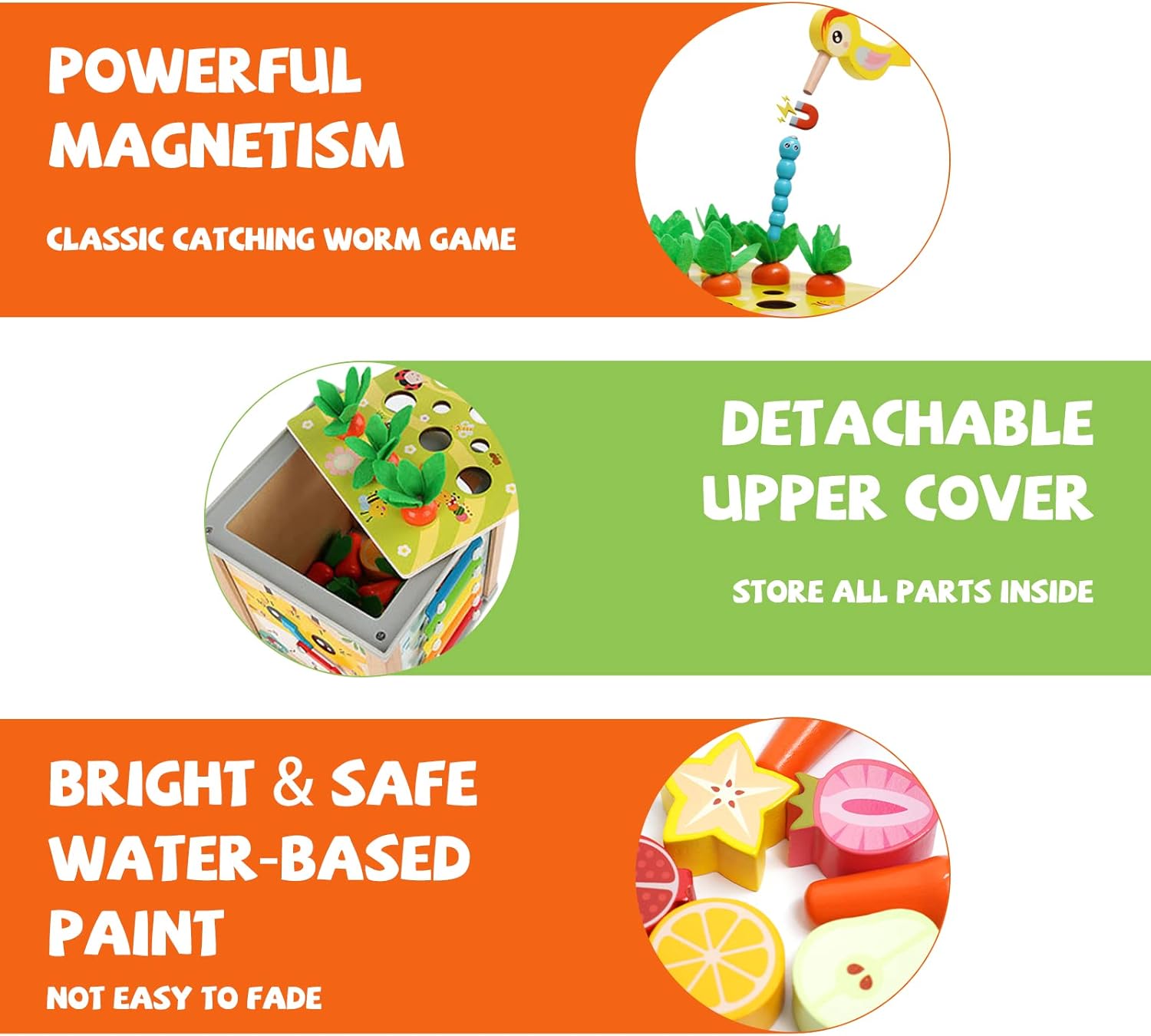 - Joc magnetic cu păsărică și viermișori: Păsărica din lemn este magnetică și poate ridica viermișorii colorați, stimulând concentrarea și dexteritatea.
