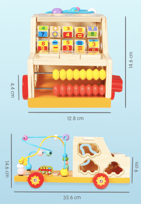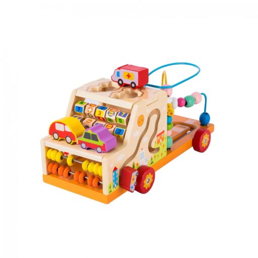 Centru de activitati educativ din lemn in forma de camion echipat cu un circuit de tip Montessori, o tabla cu operatiuni matematice, numaratoare dar si sortator de forme geometrice.