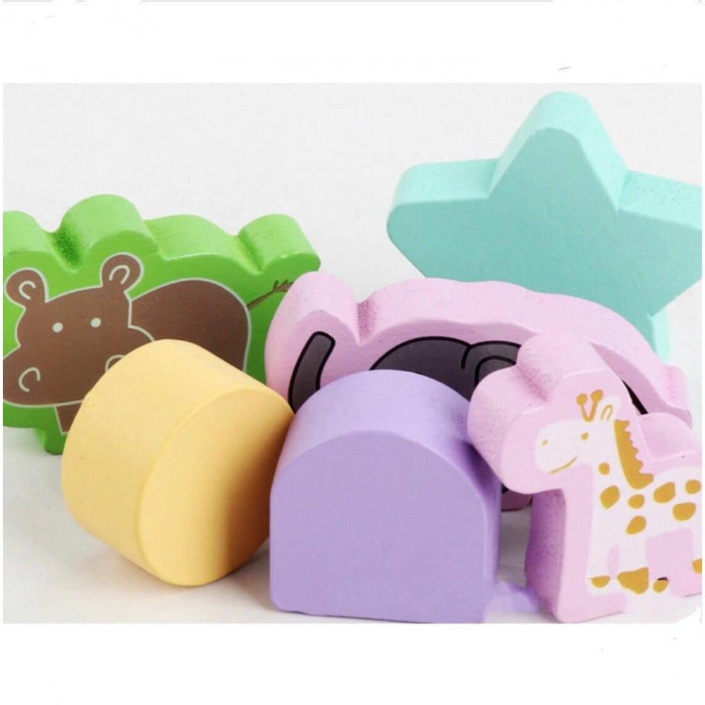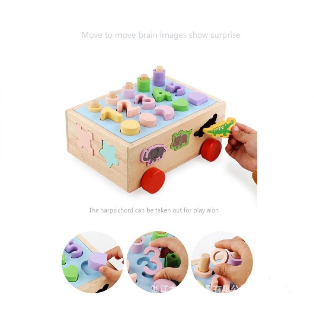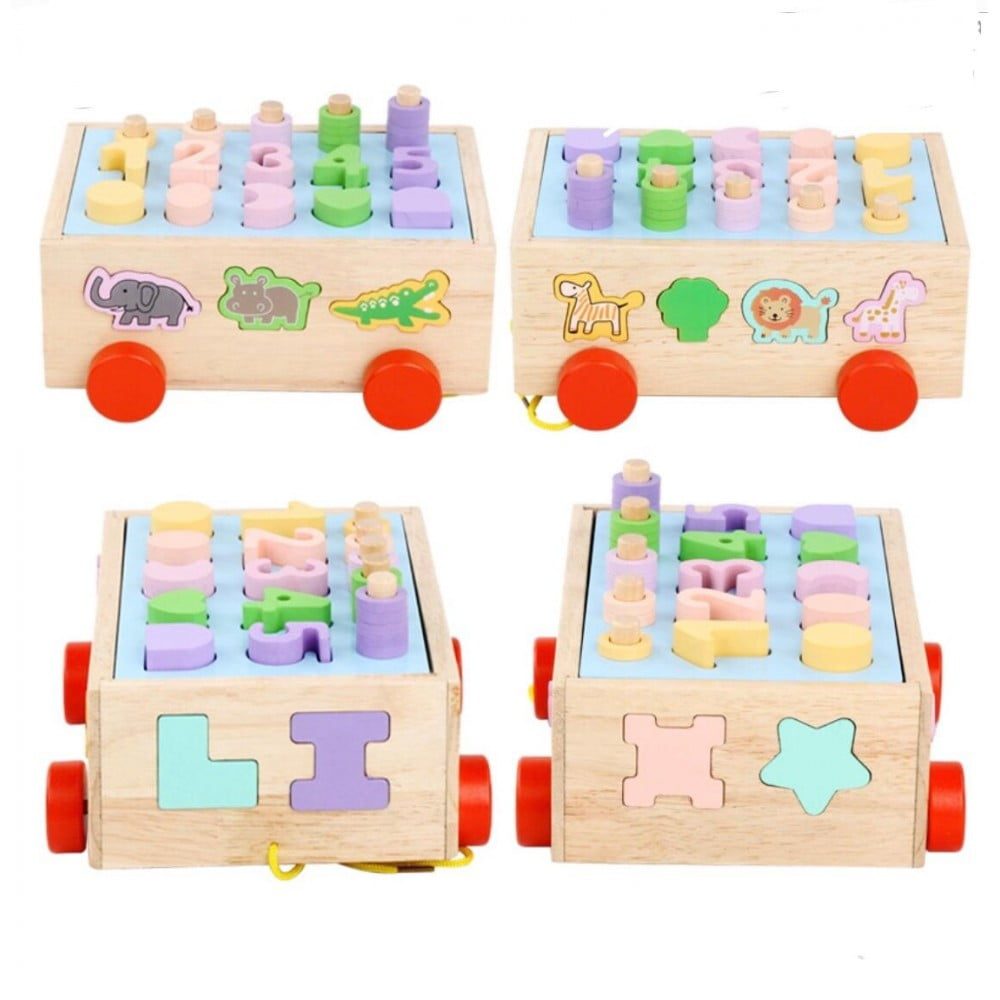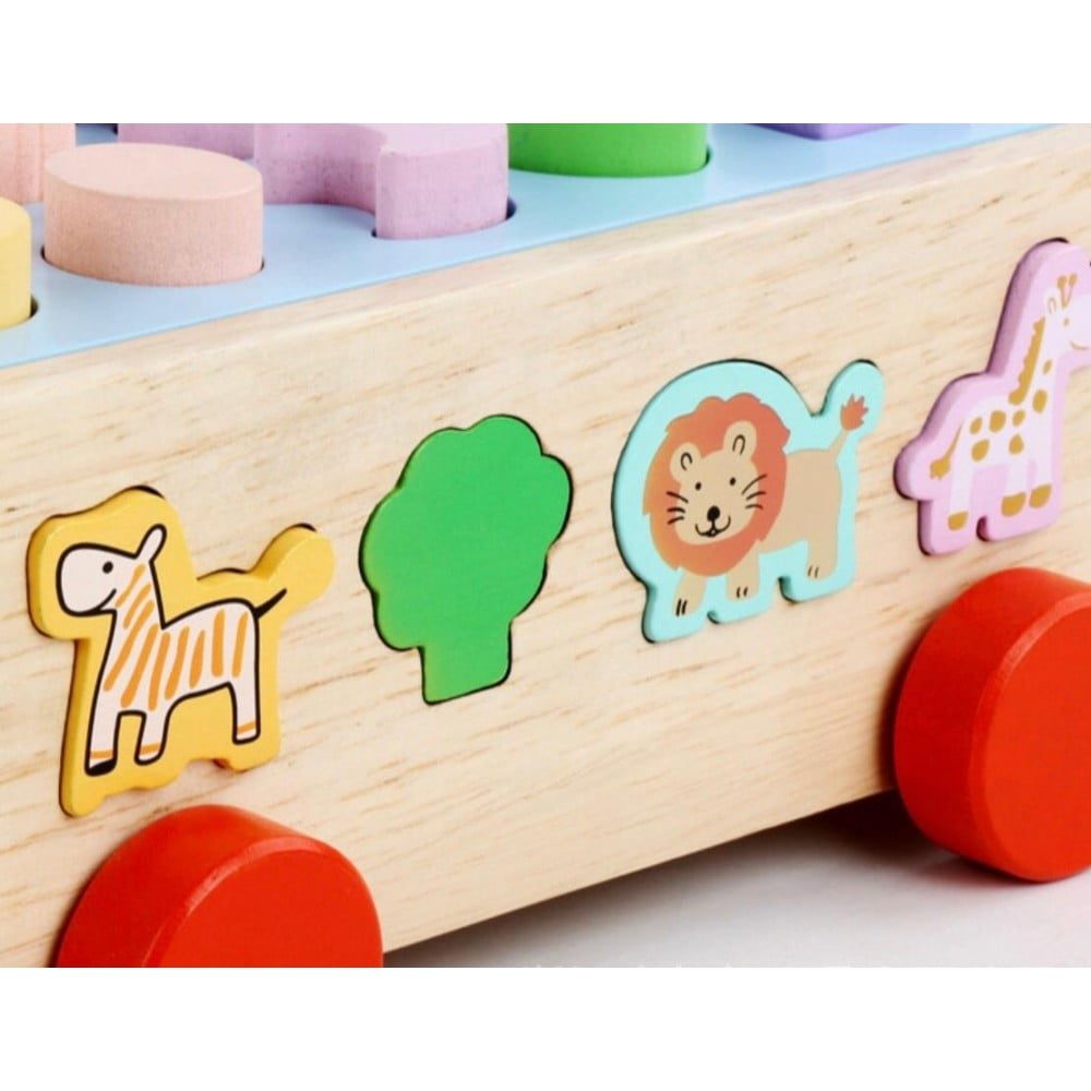 Jucarie de tras din lemn cu sortator numere, forme si animale
