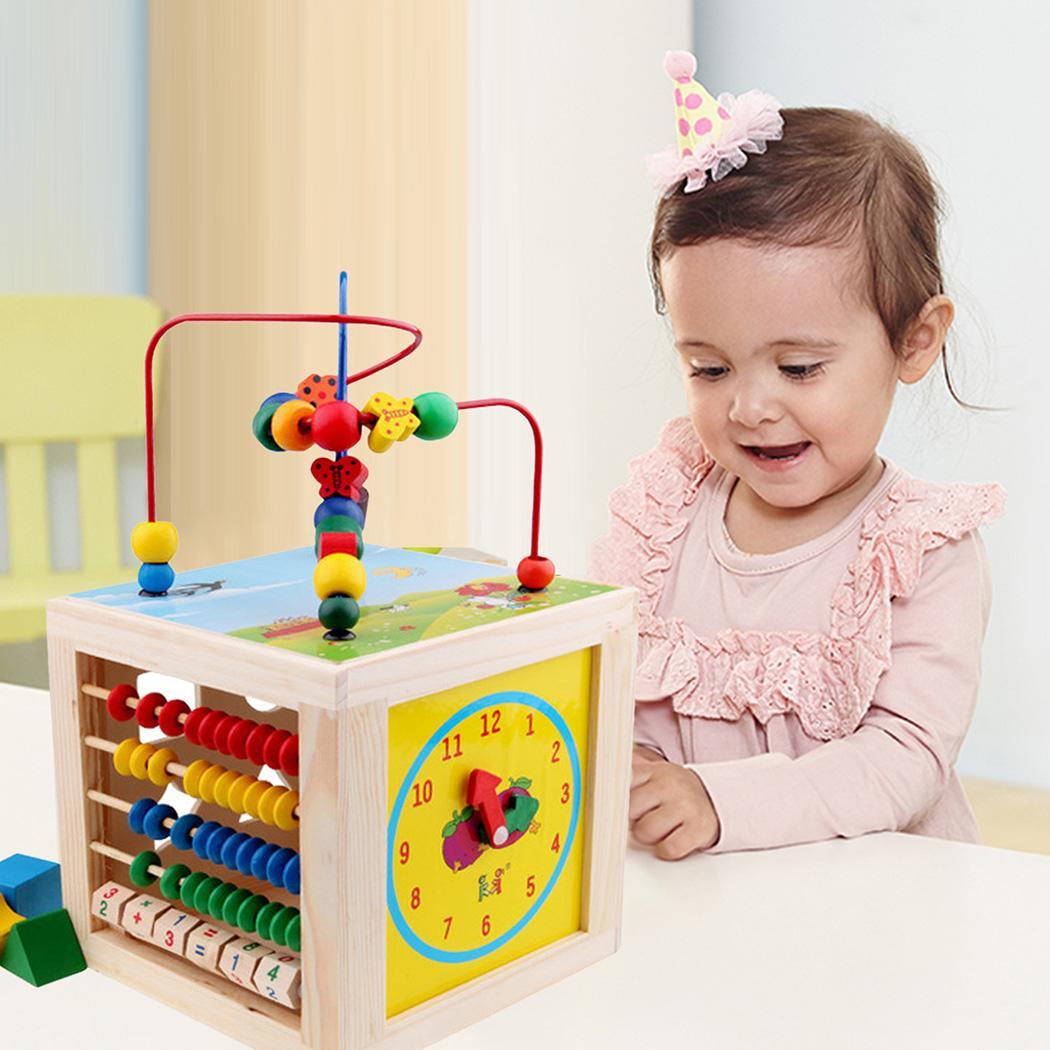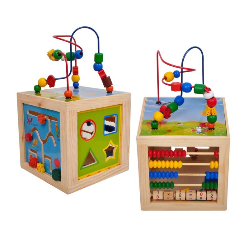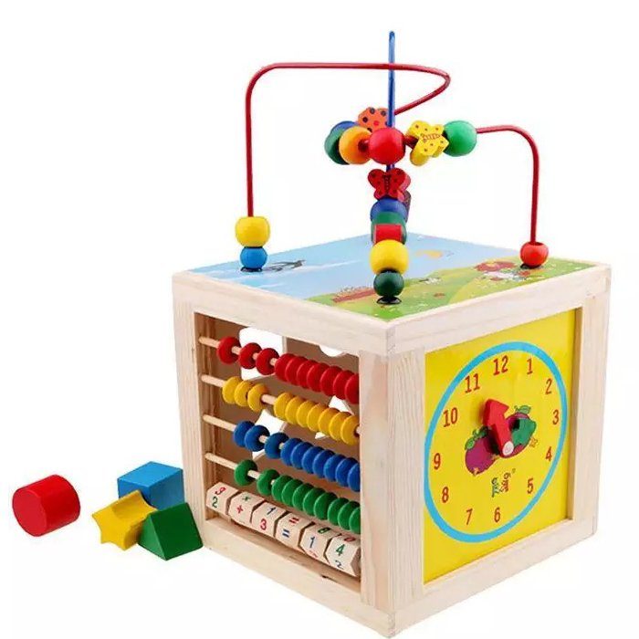 Cub educativ multifunctional 5 in 1, lemn, este o jucarie motrica pentru bebelusi datorita partii superioare care reprezinta un traseu complicat pe care se misca bilele, este o jucarie educativa pentru ca exista laturi cu labirint, potrivire de forme geometrice, ceas, acestea ajutand la invatarea notiunilor esentiale despre lumea din jur, cauza si efect.