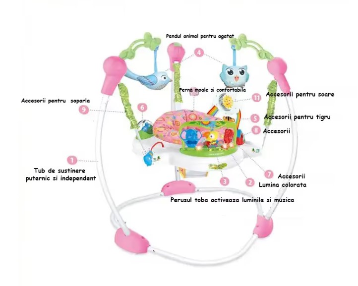 Centrul de activități „Baby Jumper” este conceput special pentru bebelușii de peste 6 luni, oferind o experiență completă de joc activ, stimulare senzorială și dezvoltare motorie.