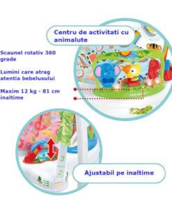 Explorare independentă: scaunul rotativ 360° încurajează mișcarea liberă și accesul la cele peste 10 jucării tematice cu animăluțe.