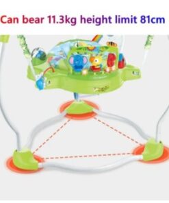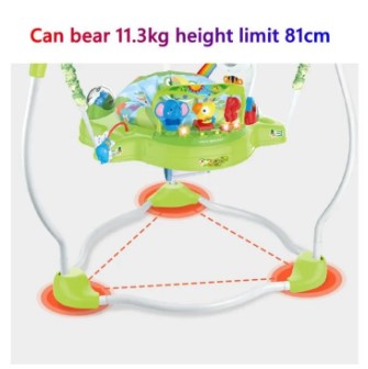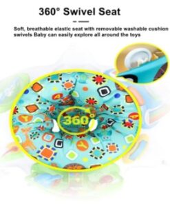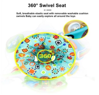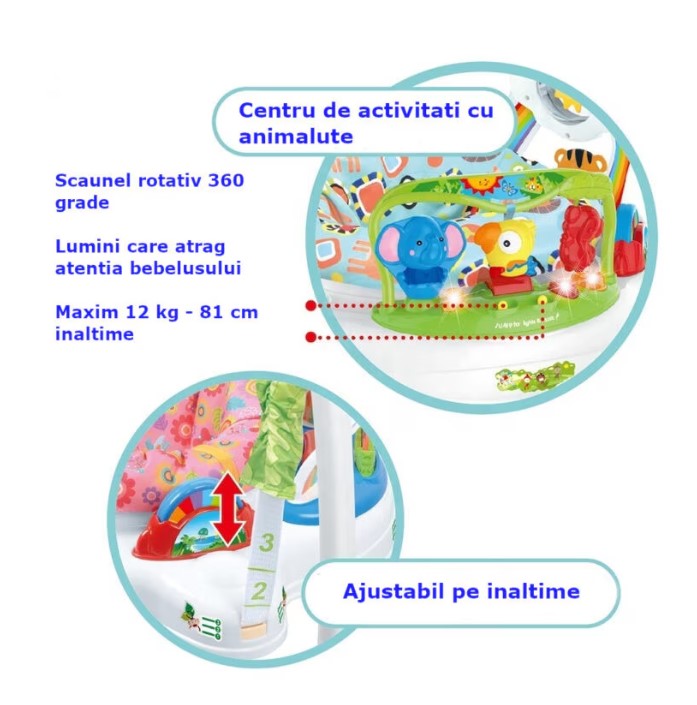 Este prevăzut cu un scaun rotativ 360°, ajustabil pe înălțime, ce permite copilului să se rotească și să exploreze în siguranță toate jucăriile înconjurătoare. Suportul robust oferă stabilitate fără a fi nevoie de fixare în tocul ușii.