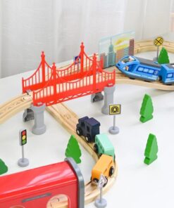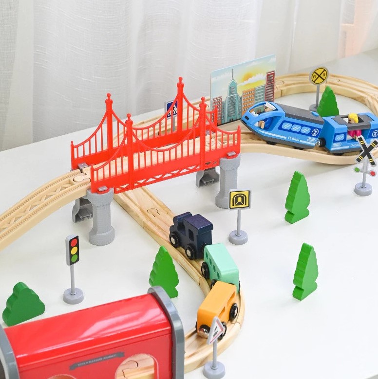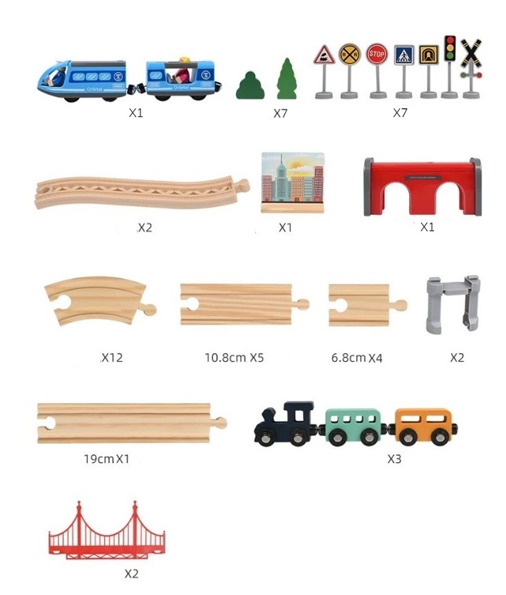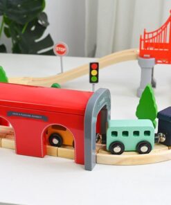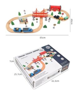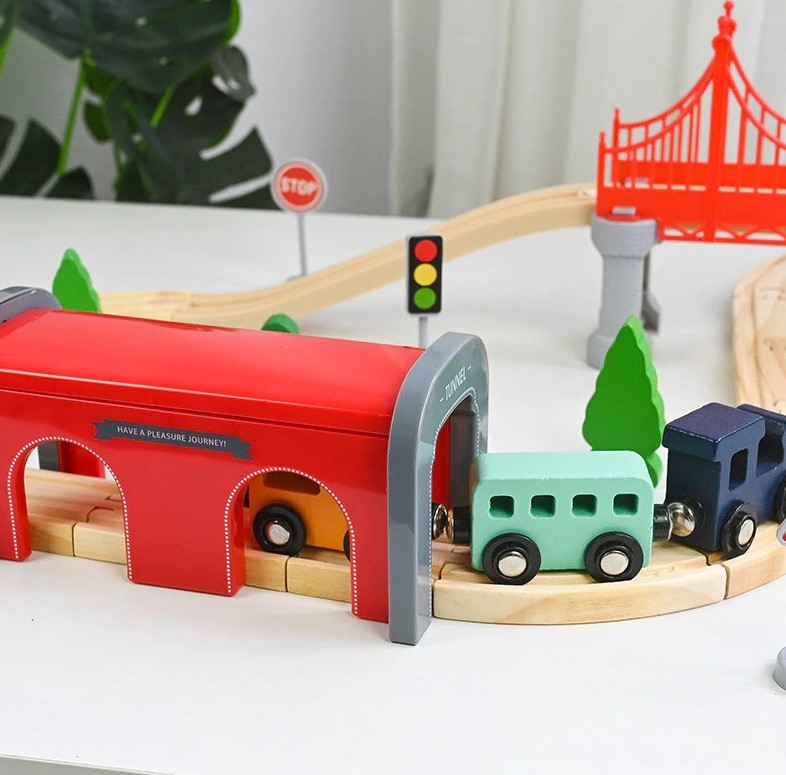 Elemente incluse: șine de lemn, trenulețe cu vagoane magnetice, pod suspendat, tunel, copaci, semne de circulație, clădiri și accesorii