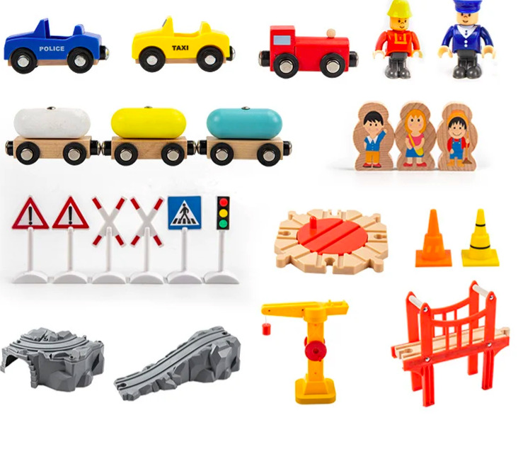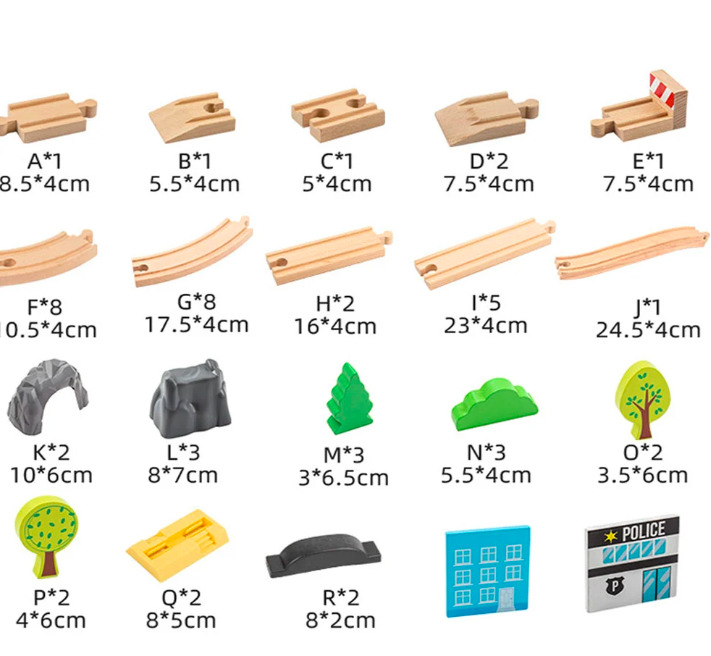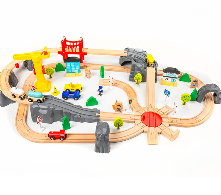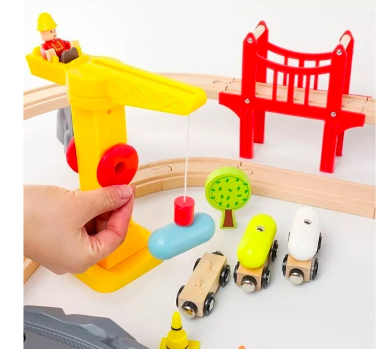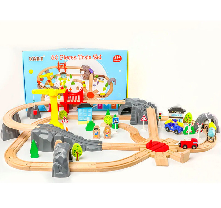- 80 de piese variate: Include șine din lemn, trenulețe magnetice, macarale, clădiri, copaci, personaje și semne rutiere, toate realizate din materiale durabile și sigure pentru copii.