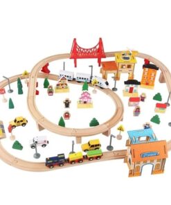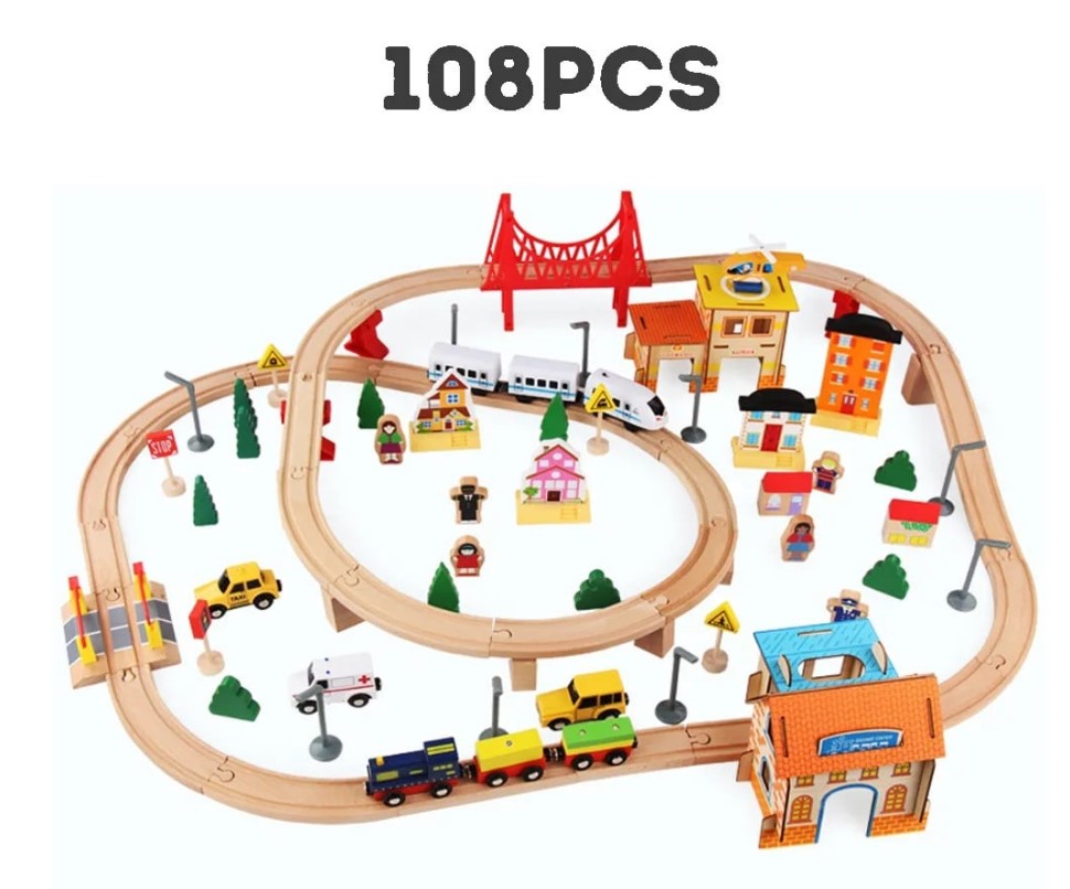 Circuitul cu trenuleț magnetic din 108 piese este un set educativ și distractiv care aduce în cameră lumea fascinantă a călătoriilor pe șine. Construit din lemn masiv și elemente sigure din PVC, setul include șine, trenuri magnetice, poduri, clădiri, mașinuțe, copaci, personaje și semne de circulație, oferind o experiență completă de joc.