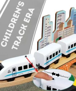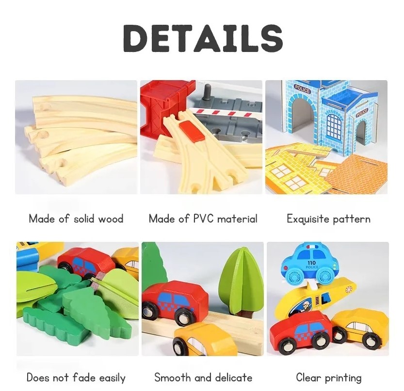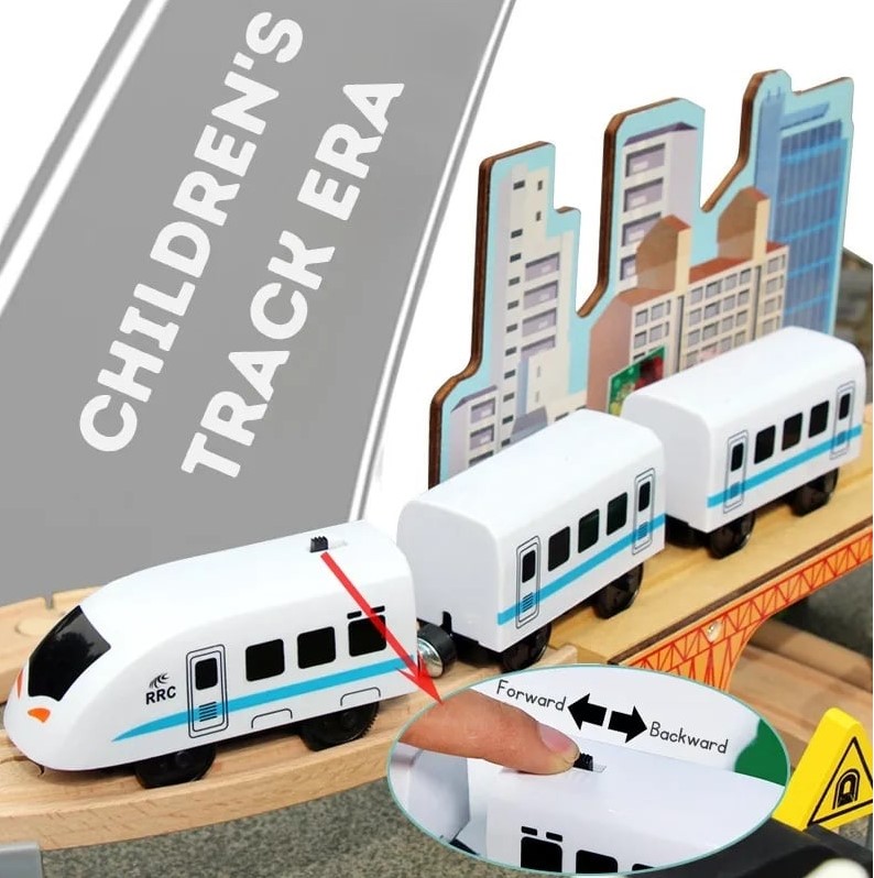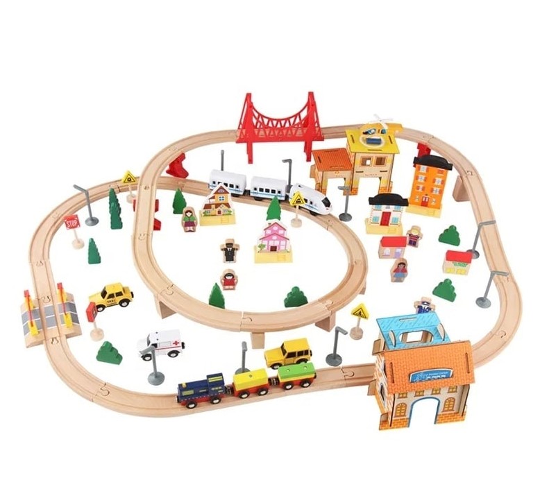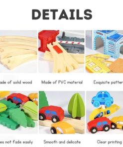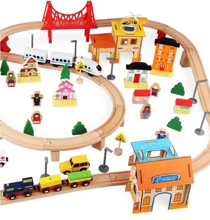Elemente incluse: trenuri magnetice, șine din lemn, pod, gară, mașinuțe, clădiri, personaje, semne de circulație și copăcei.