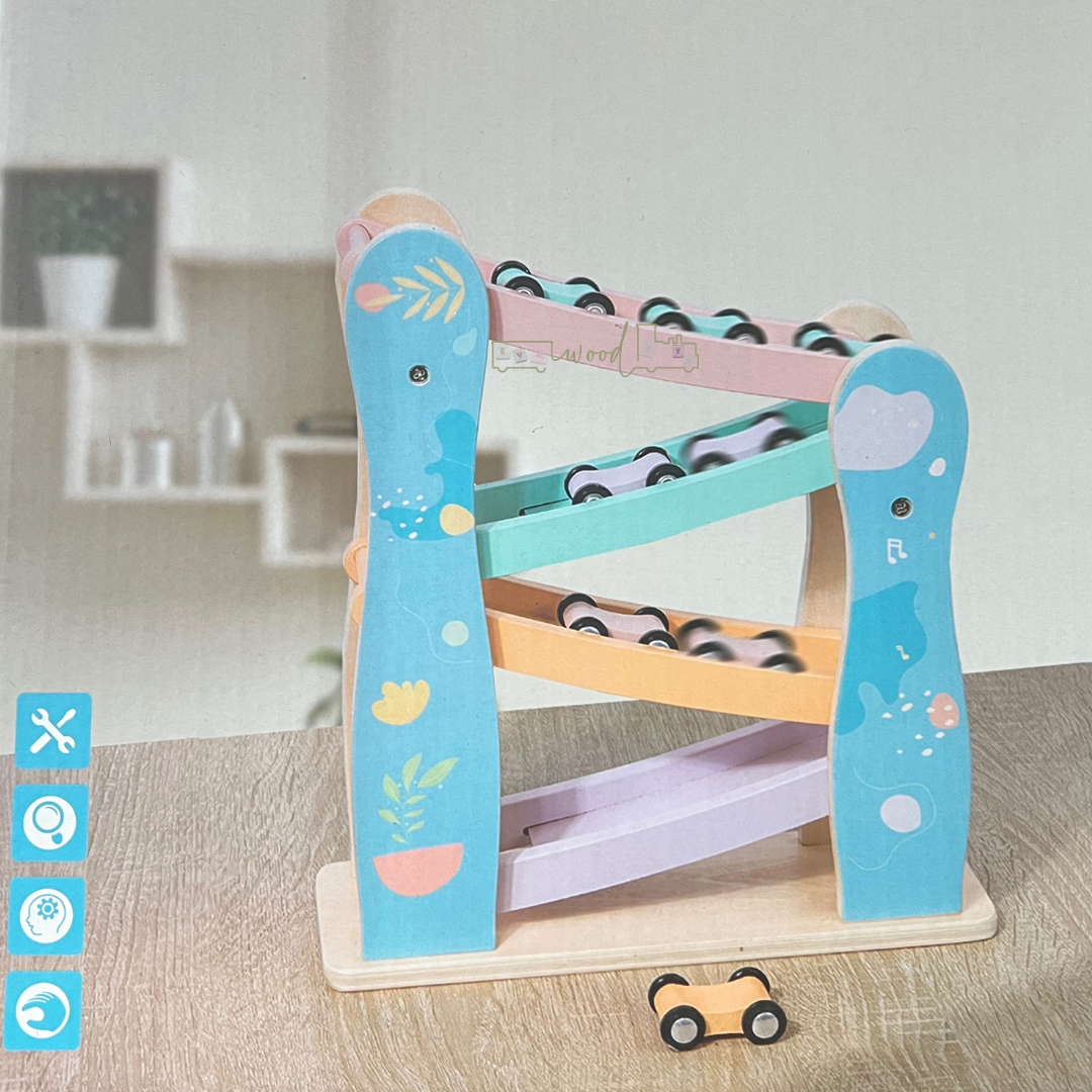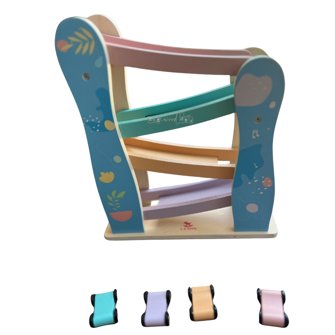 Circuit din lemn cu 4 piste si 4 masinute, Pastel
